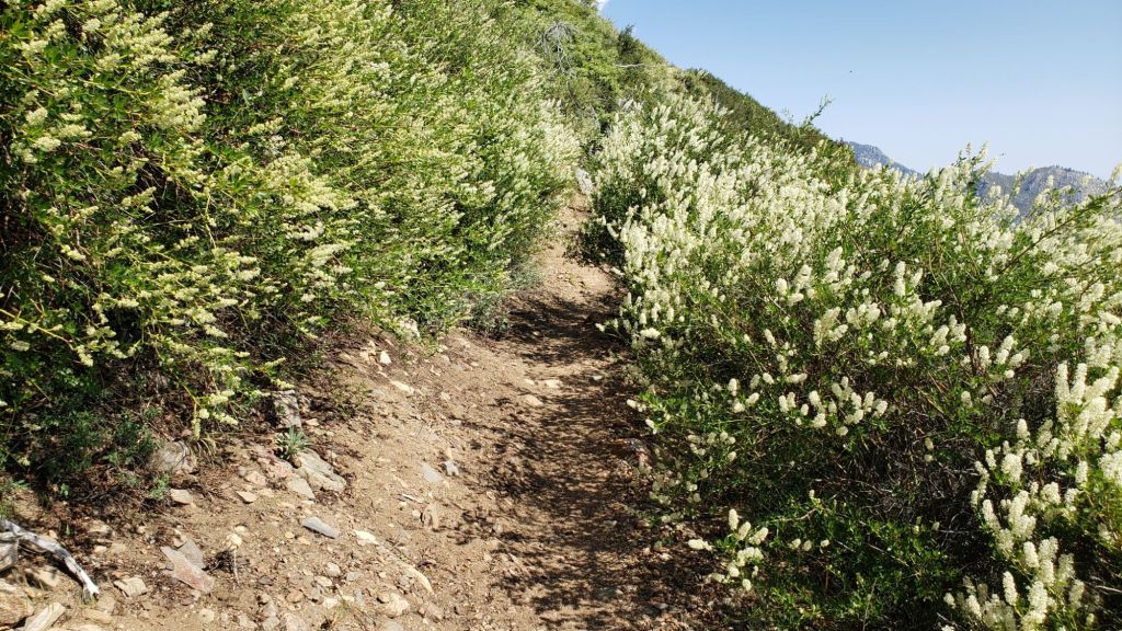 Ceanothus palmeri (Palmer Whitethorn is one of several common names) in spectacular bloom, PCT Mile 170.5 on the Desert Divide, 5th June 2025. A lovely aroma and impressively packed with insects, the only negative (as shown here) is that the whitethorn is heavily overgrowing the trail and hikers have to push through head high bushes in many places on this section.