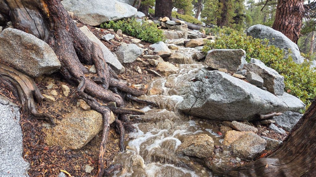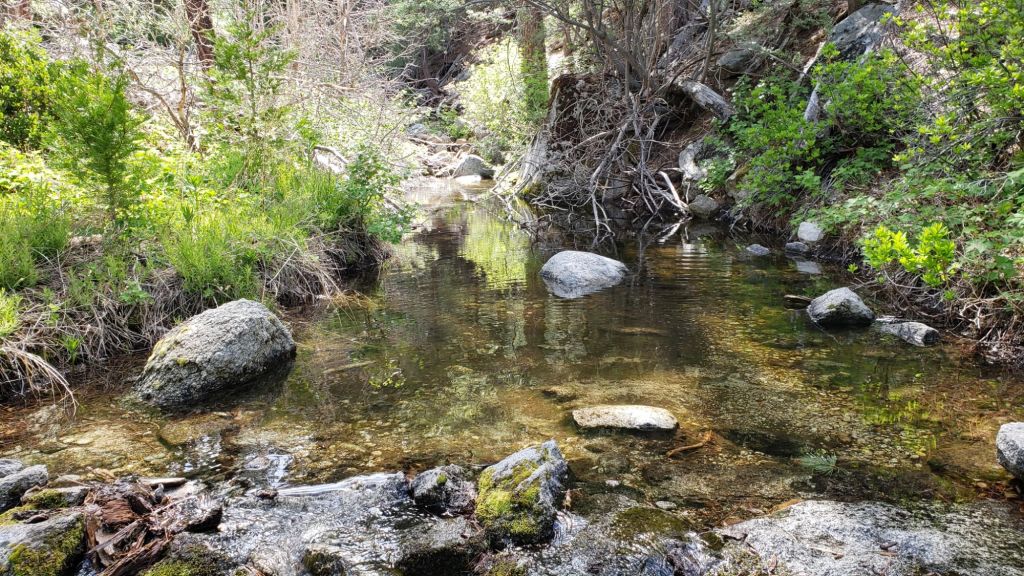 Stone Creek flowing gently where it crosses Deer Springs Trail (8350 ft) at about PCT Mile 183.7, roughly 0.6 mile north of Strawberry Junction, 29th May 2025.