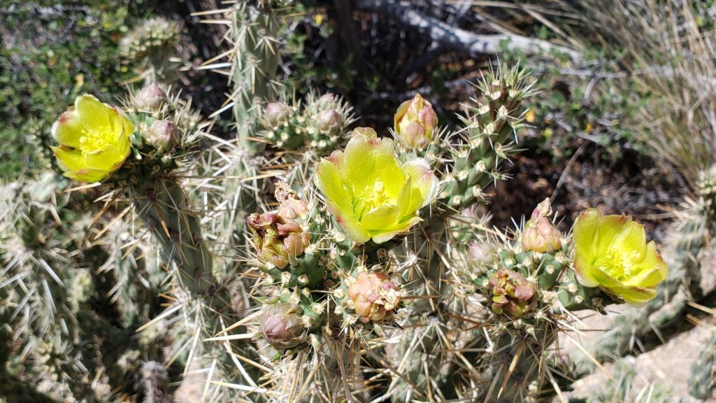 Cane Cholla (Cylindropuntia californica var. parkeri) in flower, at 5200 ft on lower Spitler Peak Trail, 5th June 2025. A nice patch of color in an otherwise poor year for semi-desert flowers in our region.