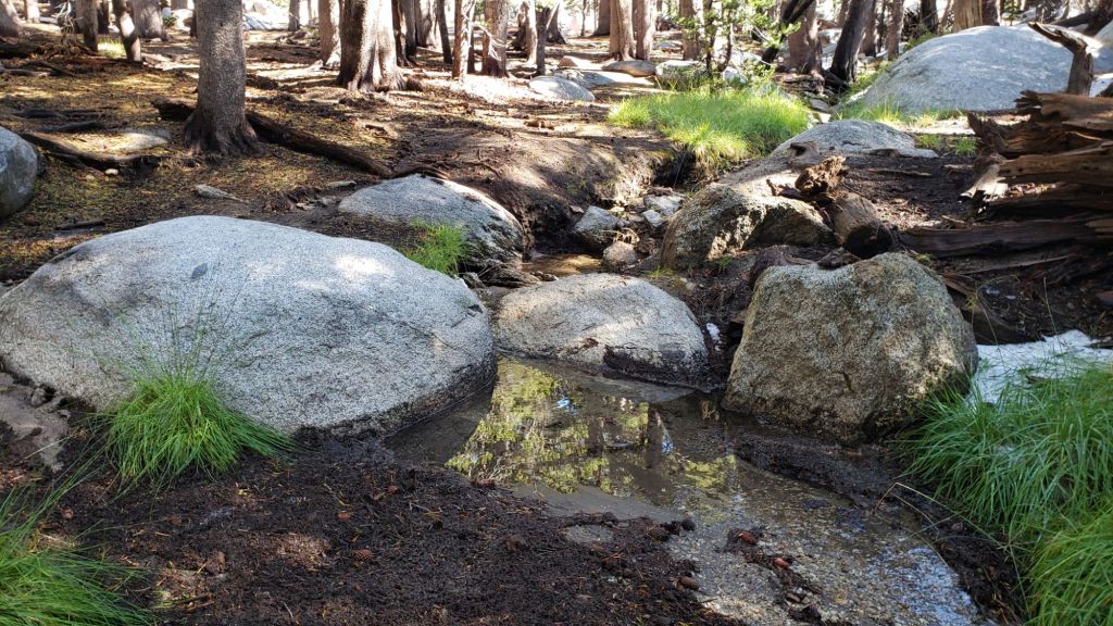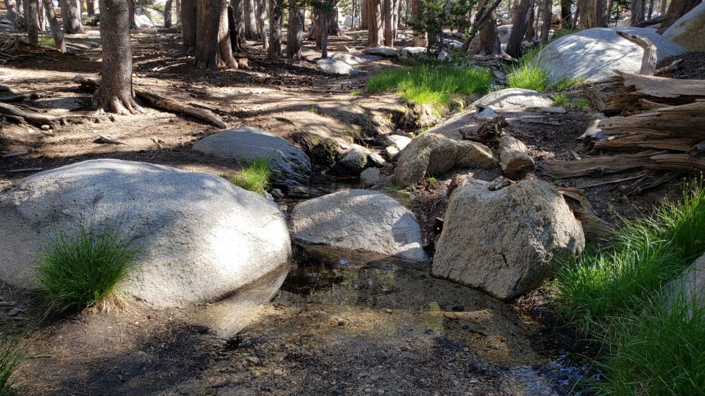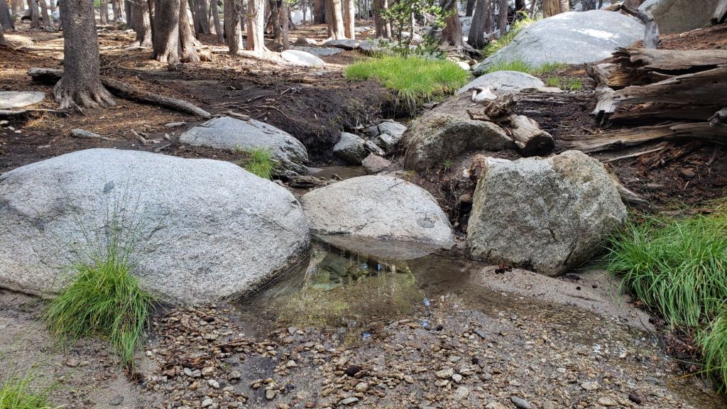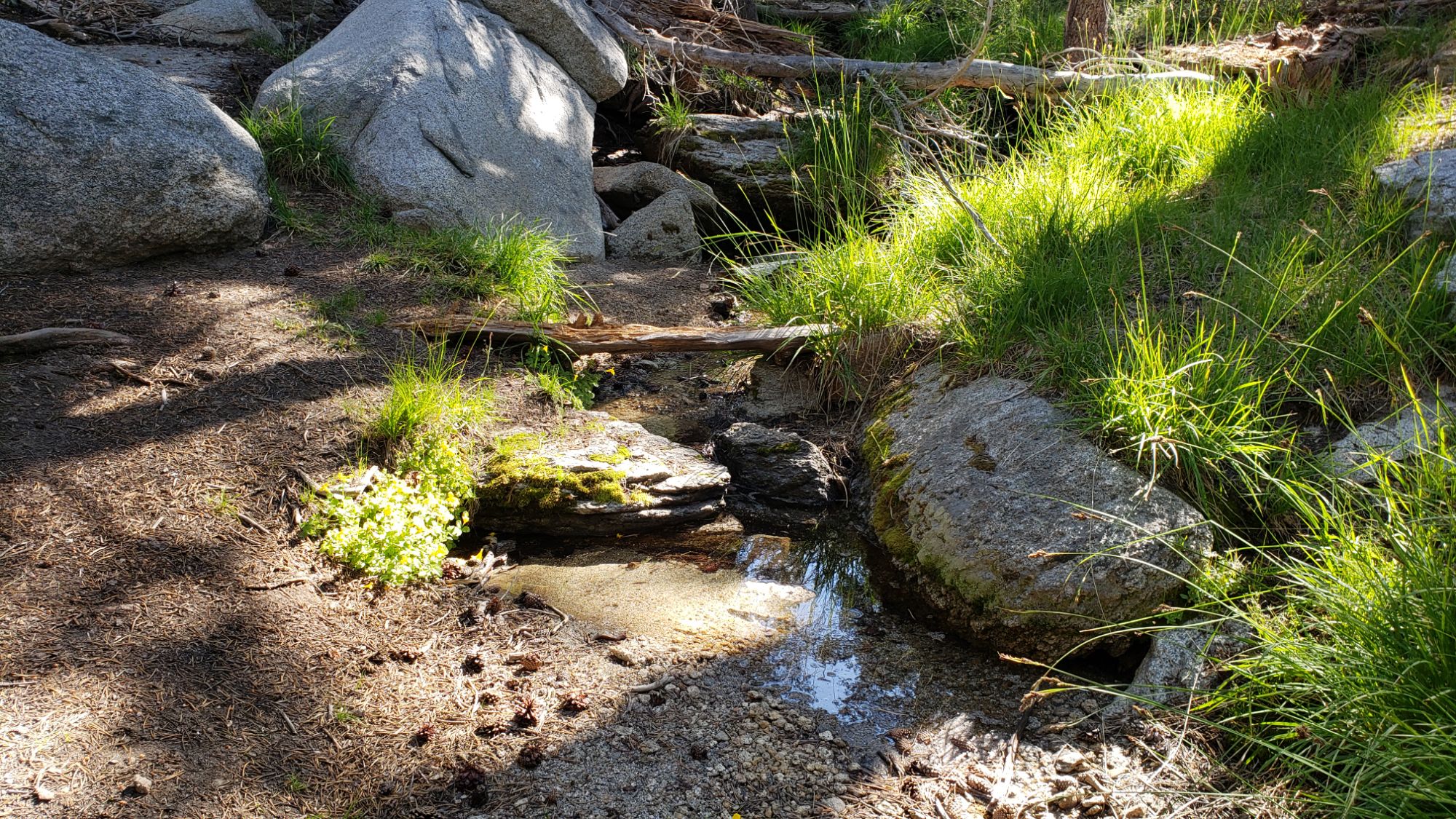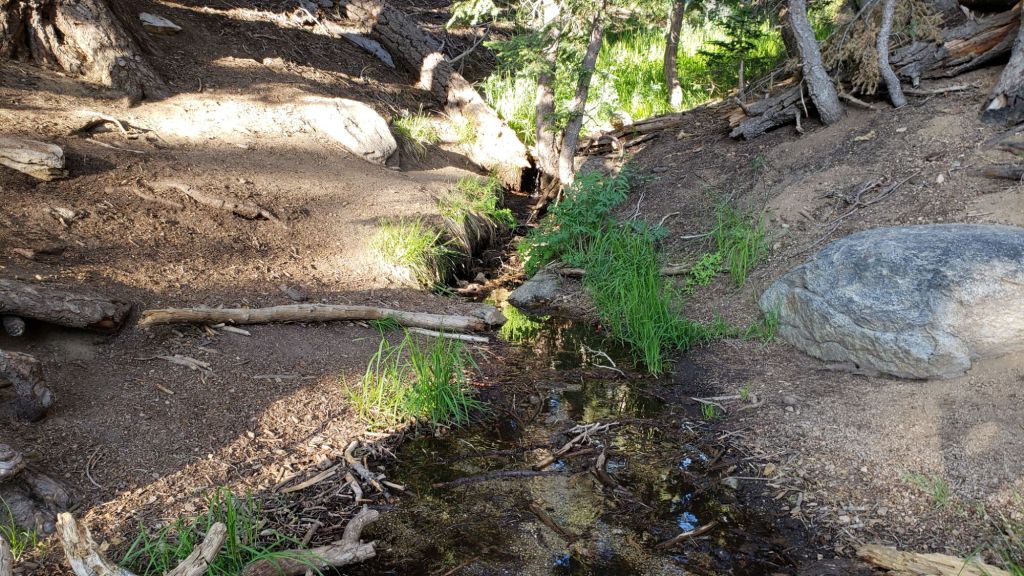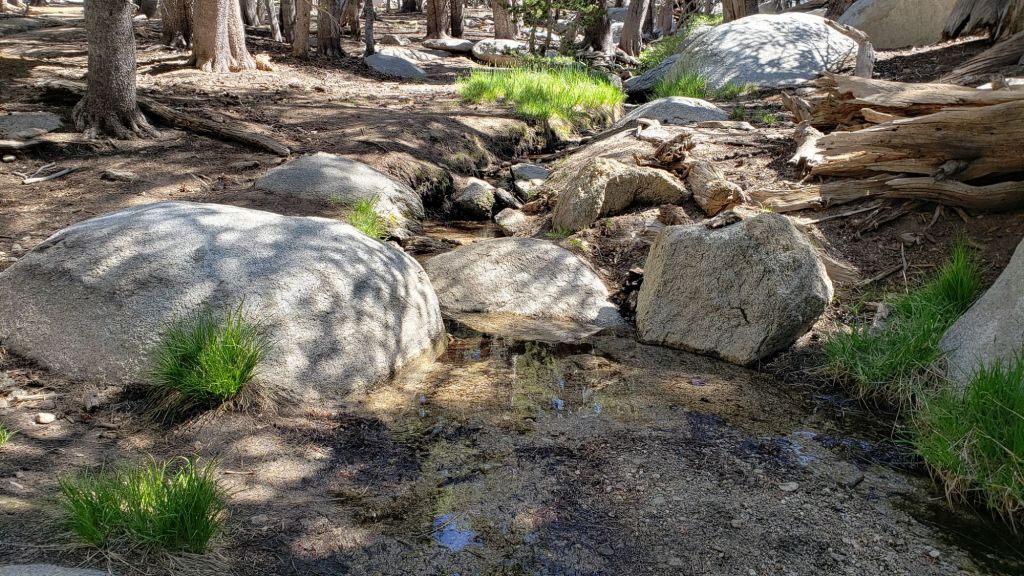 The creek in Little Round Valley where it crosses Deer Springs Trail at the west end of the valley (9700 ft), mid morning 22nd June 2025. Although flowing gently here, the creek is close to drying up further upstream where it passes through the meadow, and the low flow for mid June suggests this creek may dry by late summer.