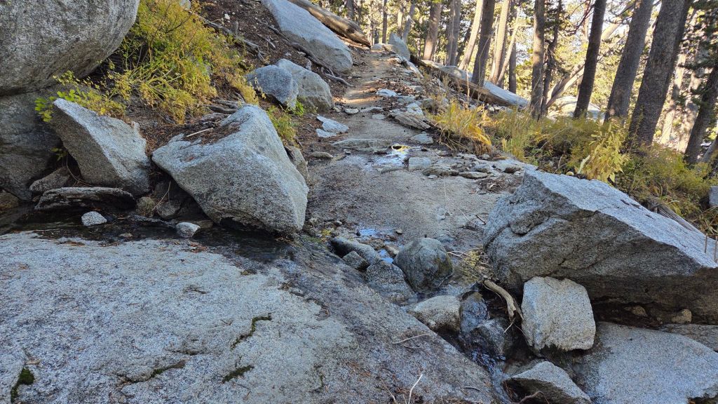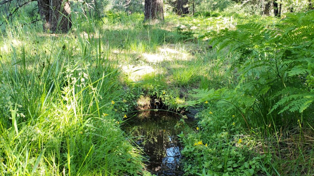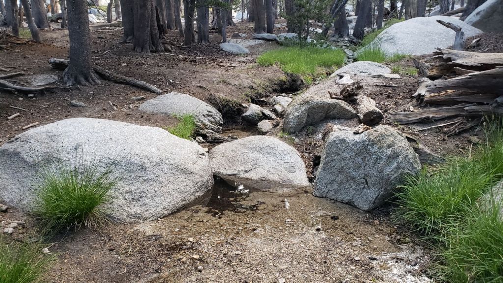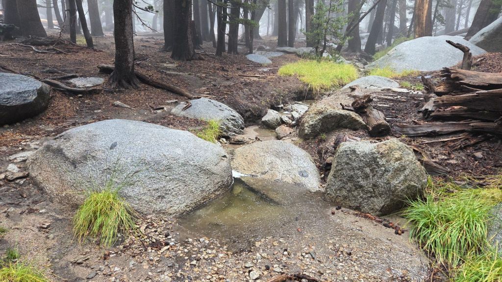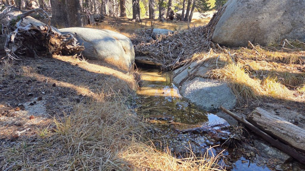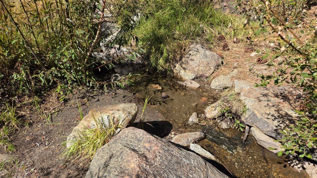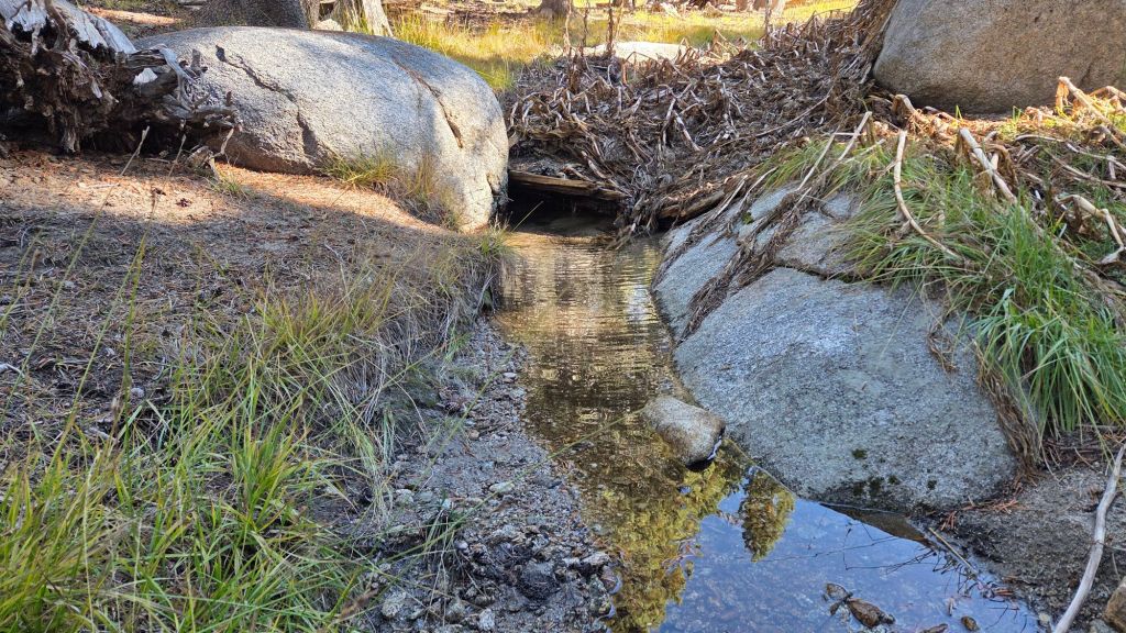 The creek in Little Round Valley where it crosses Deer Springs Trail at the west end of the valley (9700 ft), mid morning 22nd June 2025. Although flowing gently here, the creek is close to drying up further upstream where it passes through the meadow, and the low flow for mid June suggests this creek may dry by late summer.