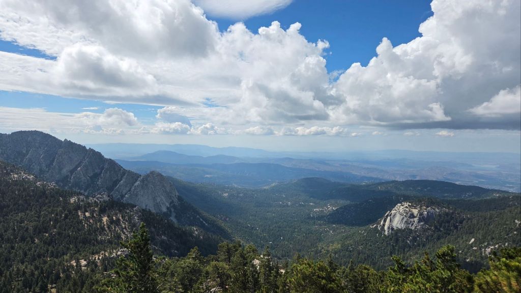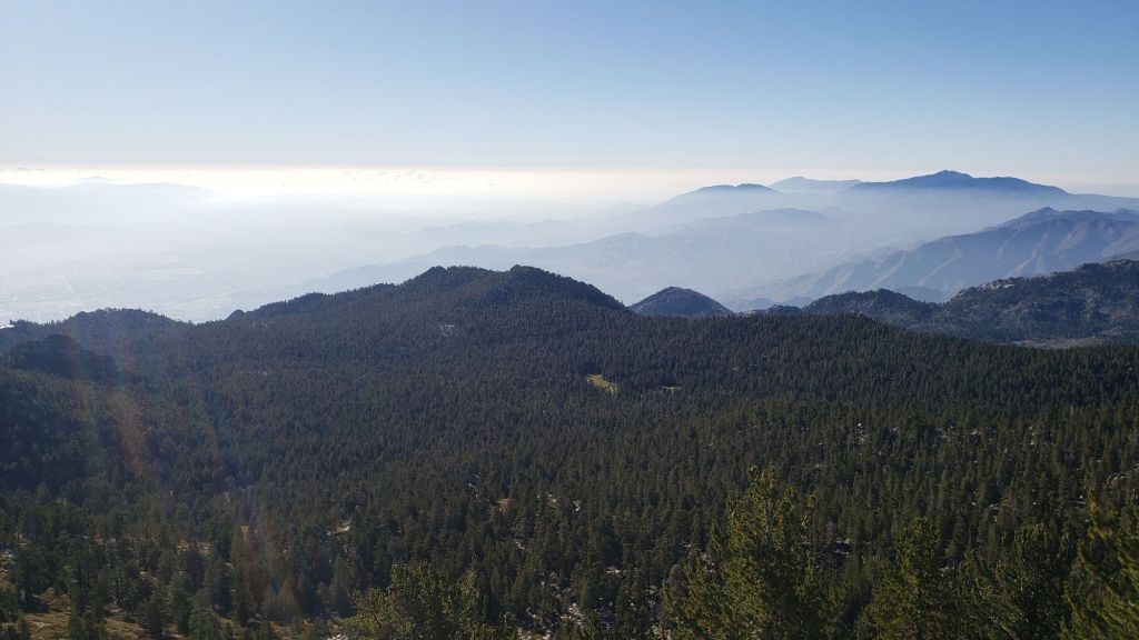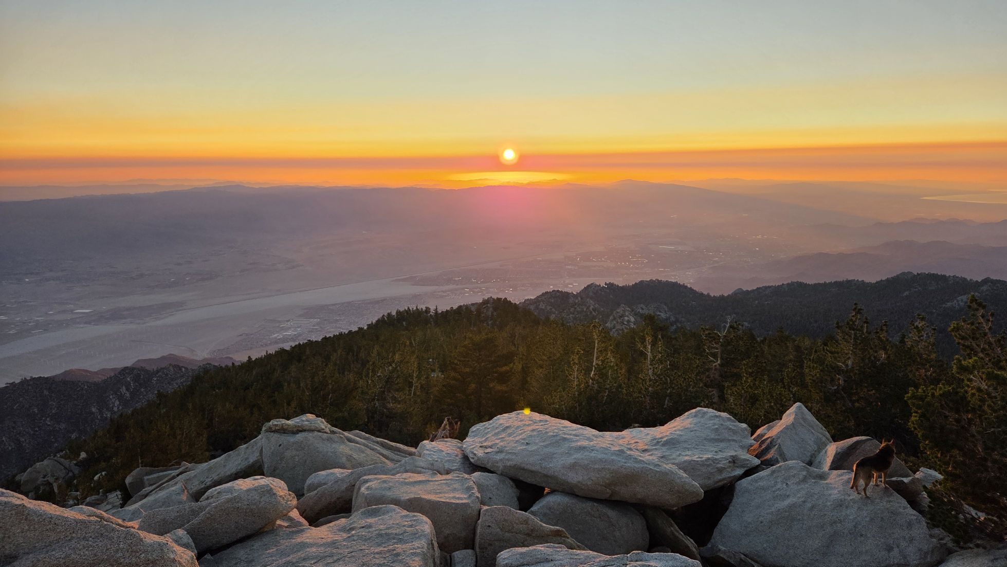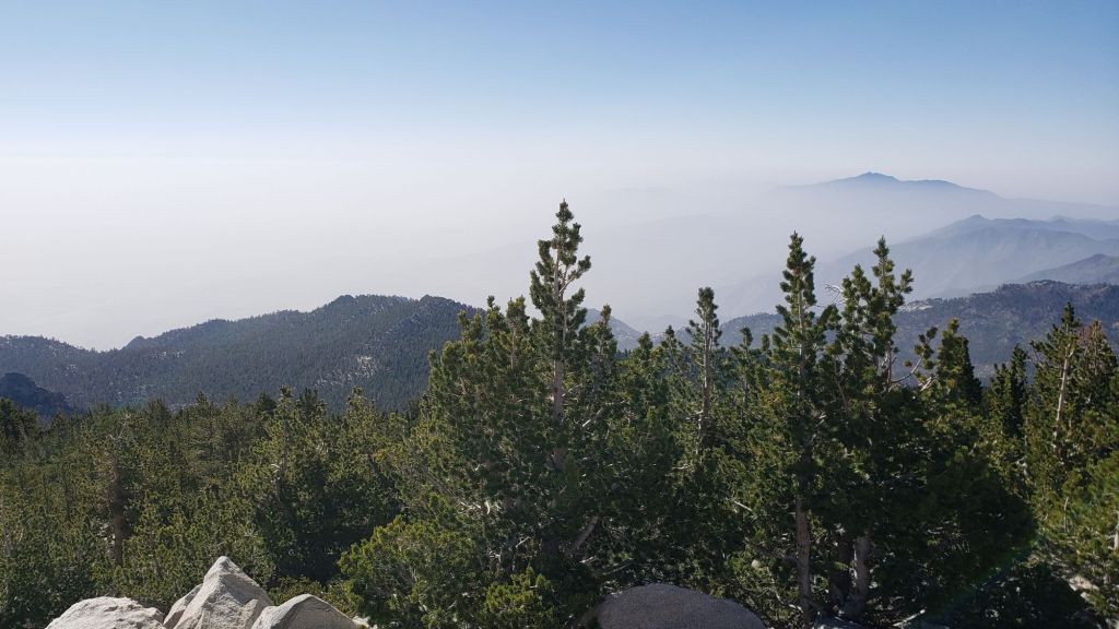 The “view” of the Coachella Valley looking south-east from San Jacinto Peak, mid morning on Sunday 22nd June 2025. Thick haze enshrouded all of lowland Southern California, with a ceiling near 9000 ft elevation. Toro Peak (8717 ft), the high point of the Santa Rosa Mountains, is the distant prominent peak to the upper right.