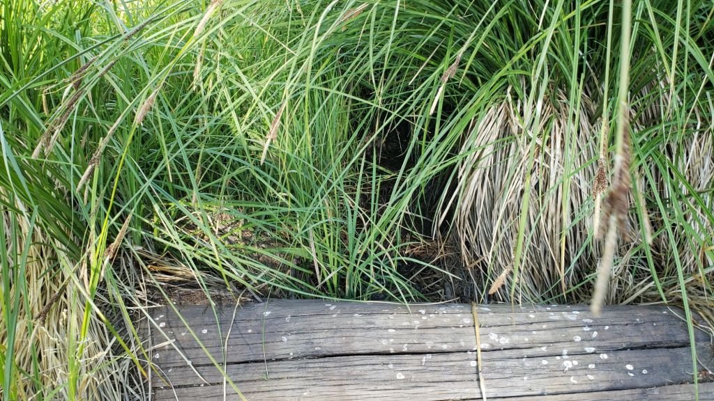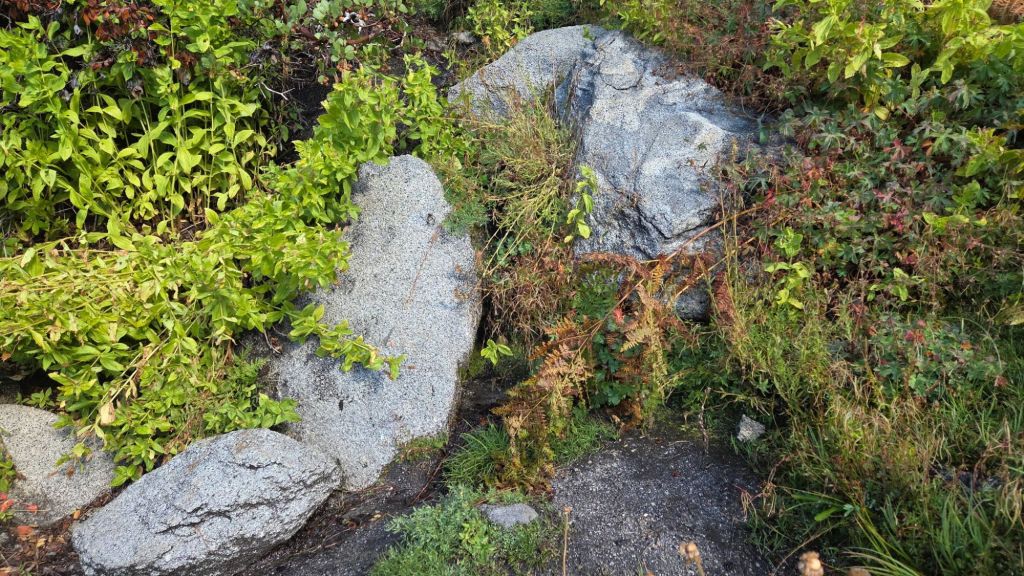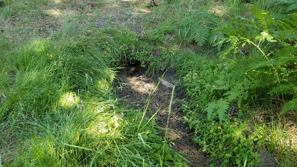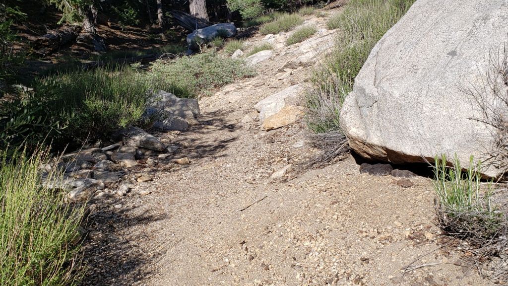 A large adult Southern Pacific Rattlesnake next to the meadow trail between Little Tahquitz Meadow and the PCT, early morning 26th June 2025. The air temperature was only about 55F (much cooler in shaded areas) and this snake was very sluggish, but had enough energy to rattle at me when I stepped to within about two feet (Anabel was behind me). The image below shows its location relative to the trail, but as we were coming from the opposite direction the snake was impossible to see until I was right next to it.