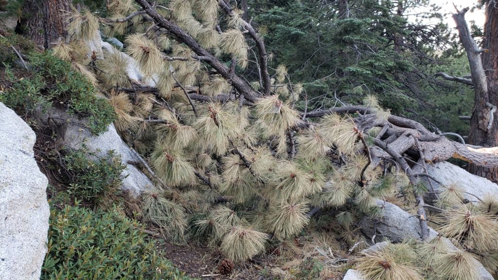 Work since mid 2024 by various PCTA-USFS-ACE crews has largely resolved the backlog of downed trees on PCT Miles 170-175 (roughly Apache Peak to Red Tahquitz) accumulated during several years of agency neglect. Six trees remain to be cut around South Peak (Miles 173.5-174) of which most are significant obstructions for hikers [surveyed June 2025]. Lengthy sections of the trail are overgrown with brush and in urgent need of trimming, especially most of Miles 168-174. Regrettably post-fire erosion has created a loose, rocky, and uneven tread in parts of the same section, requiring significant caution in places.
