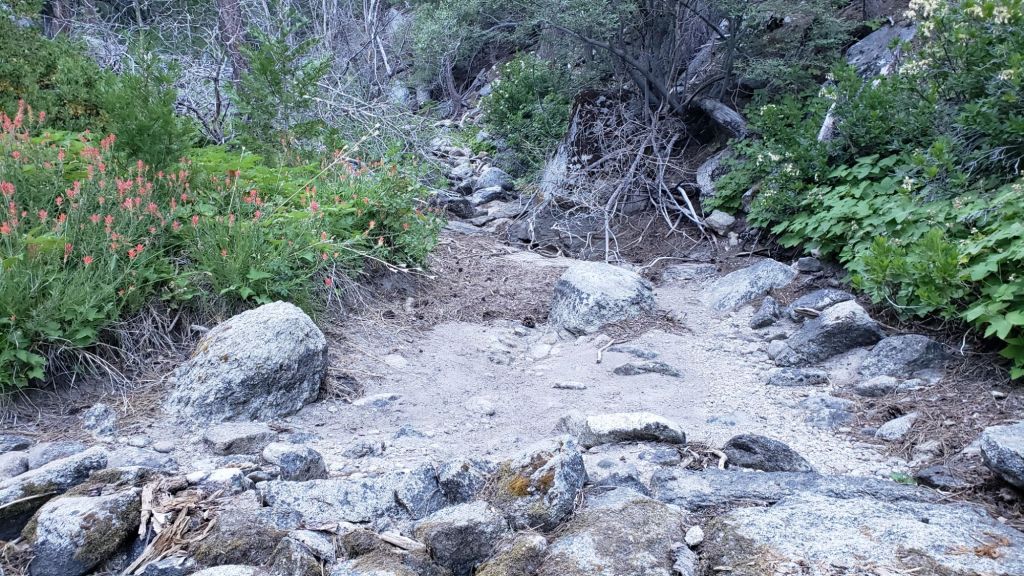 Spitler Creek continuing to flow gently, here at its lowest crossing of Spitler Peak Trail about 3.2 miles up from the trailhead, 5th June 2025.