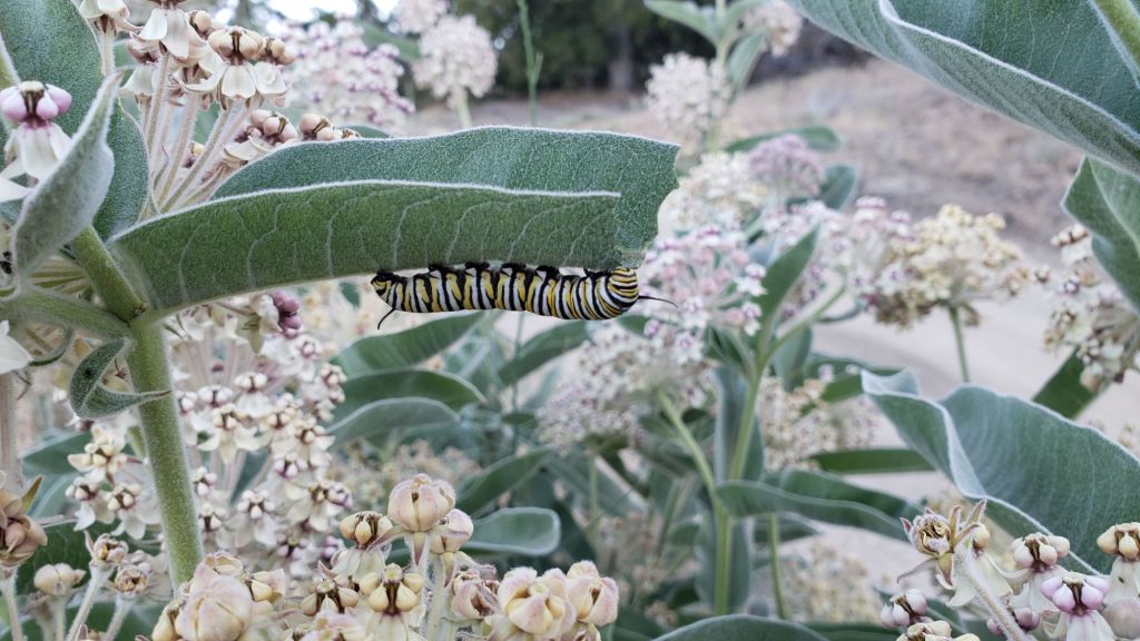 Above, a large Monarch butterfly (Danaus plexippus) caterpillar feeding voraciously on Woollypod Milkweed (Asclepias eriocarpa) at 5600 ft near Idyllwild, 5th July 2025. Below, a Monarch chrysalis found the same morning. The distinctive wing pattern was just visible through the translucent casing, and a check the next day found that this butterfly had emerged and flown.