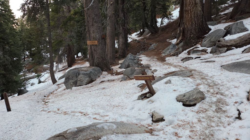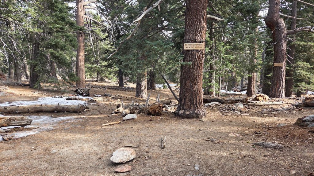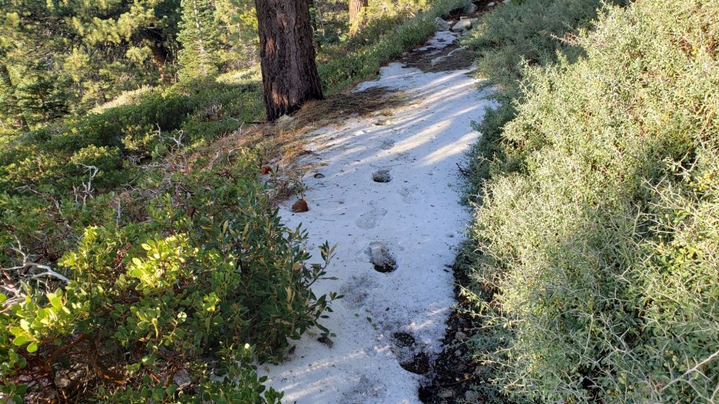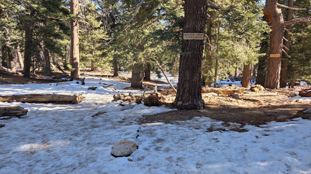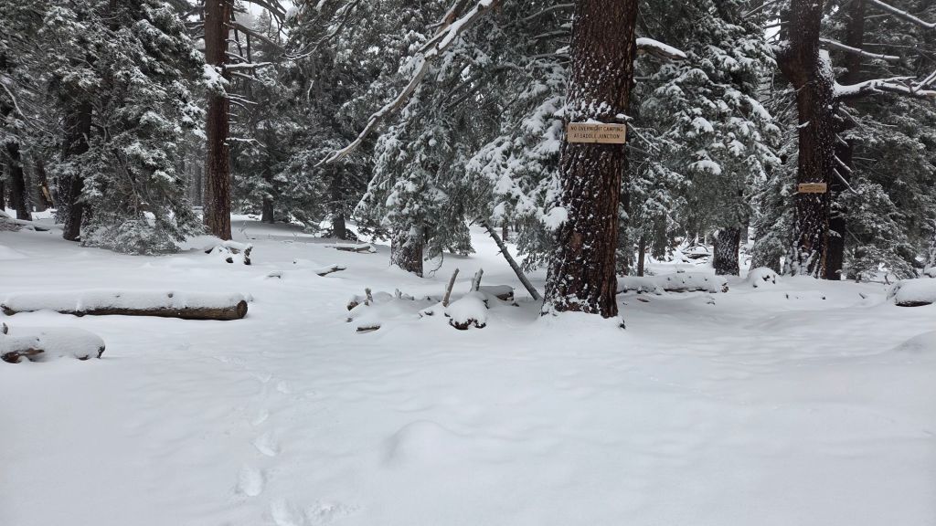 Annie’s Junction (9020 ft, PCT Mile 180.8), early morning 18th December 2025. This area tends to accumulate drifting snow and is well forested, and for both reasons it is notoriously slow to melt off even in spring. It is a remarkable indication of how warm it has been that this section of trail has cleared in late December, when the Sun is at its annual nadir.