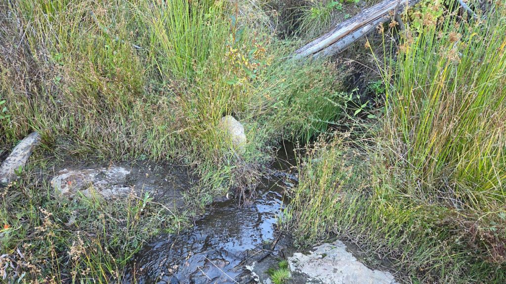 The creek in Little Round Valley where it crosses Deer Springs Trail at the west end of the valley (9700 ft), early morning 25th July 2025. Although flowing gently here, the creek is steadily drying further upstream where it passes through the meadow.