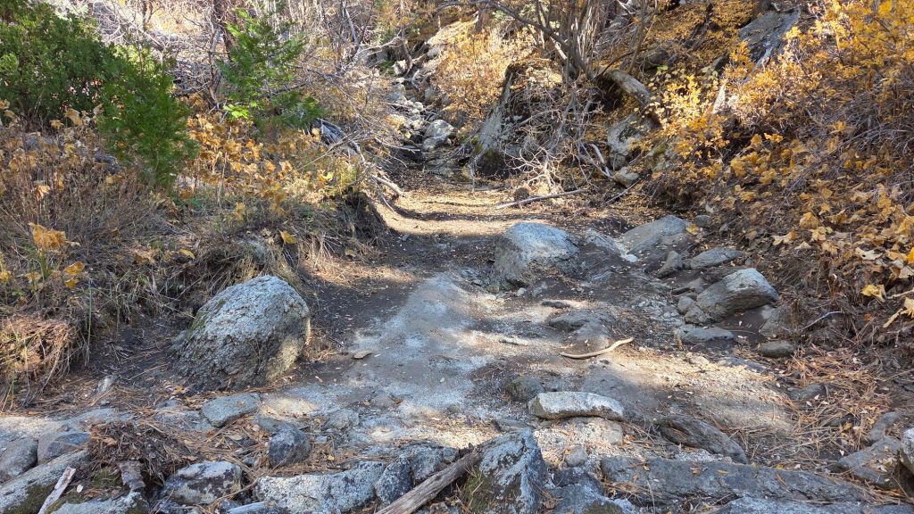 From Laws east to Caramba the original Caramba Trail has been cairned by myself and others and can largely be followed with careful route-finding. My most recent 2025 survey counted 120 trees down on this 2.1 miles of trail. It is extremely obscure for the first 0.5 mile east of the Willow Creek crossing, becoming more obvious (but still subtle) as it descends towards Caramba. Very cautious navigation is strongly recommended throughout the area.