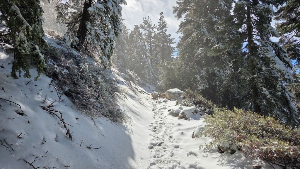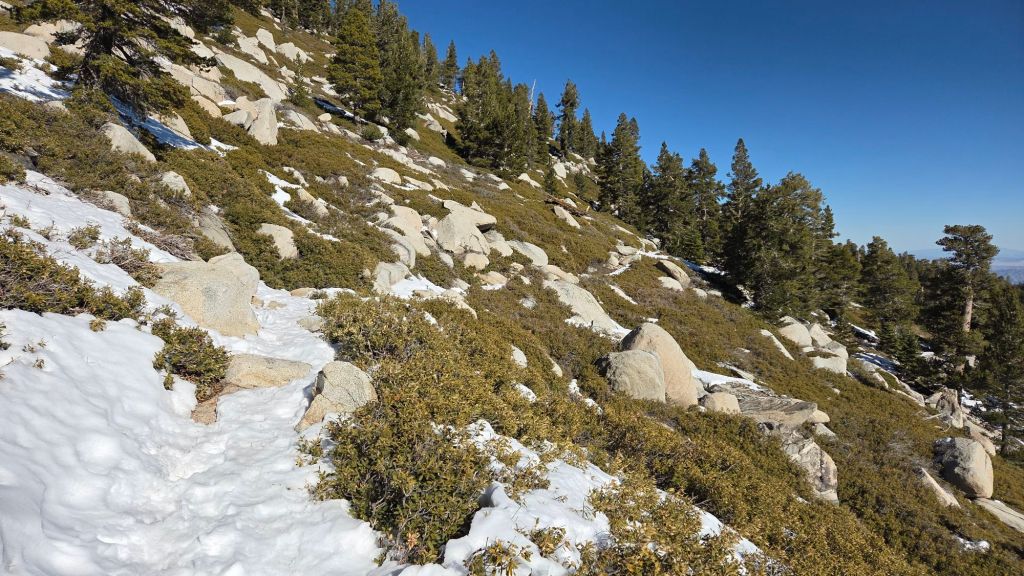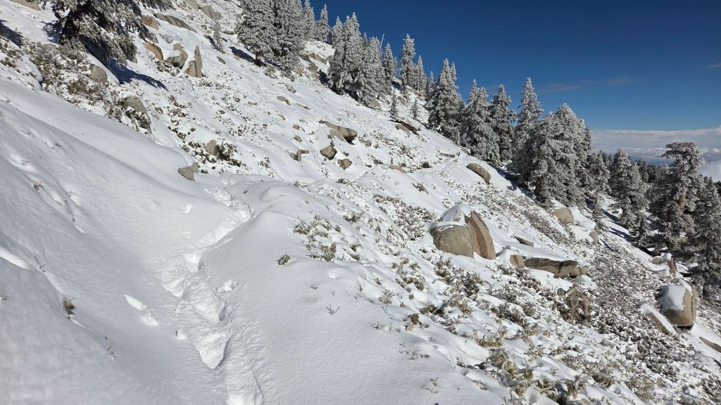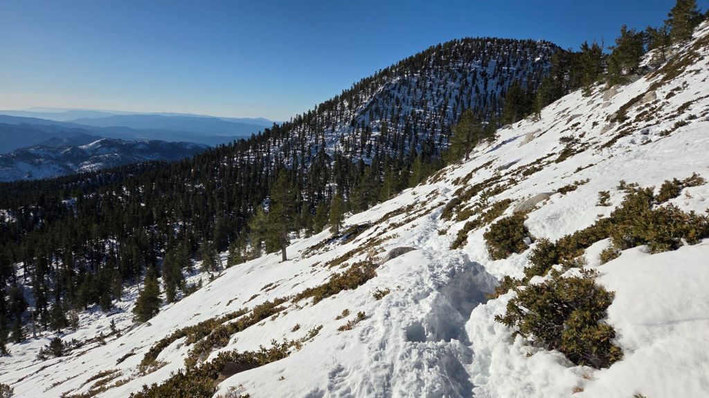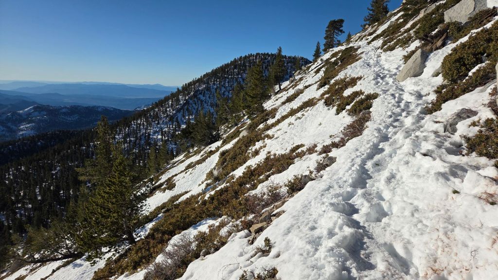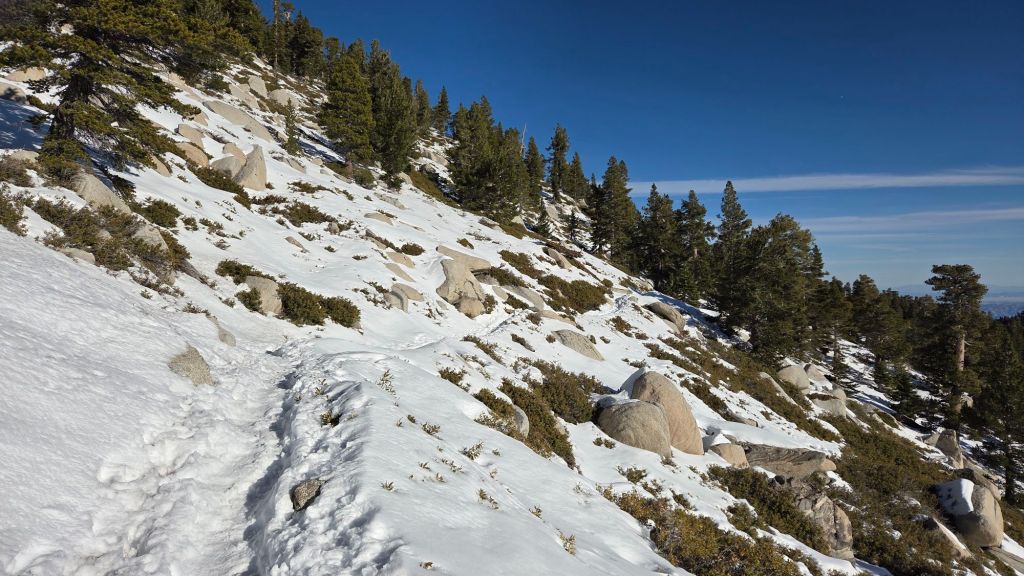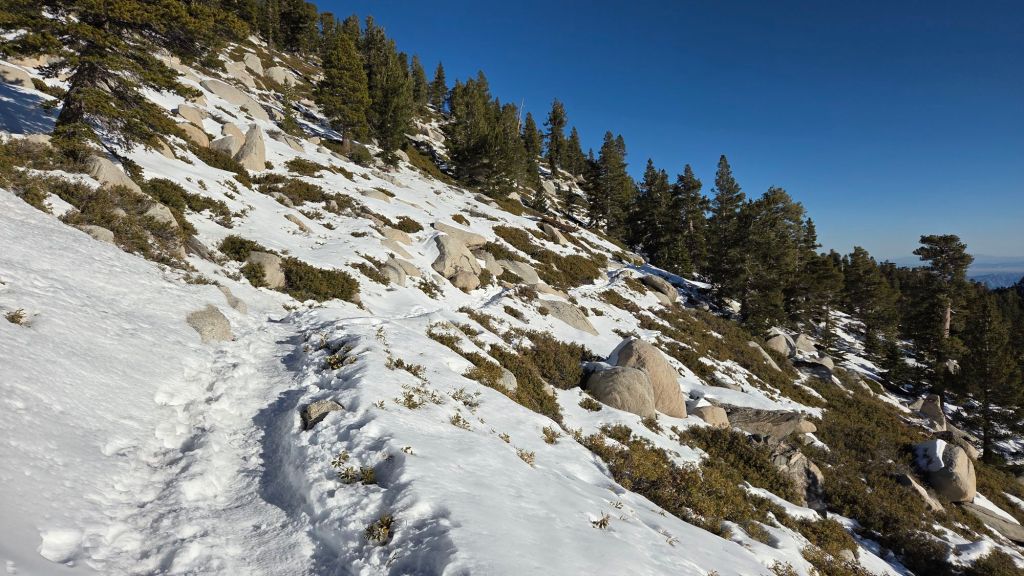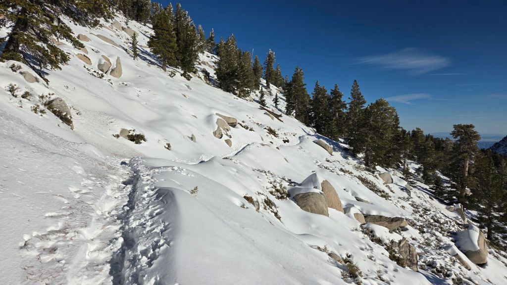 The 0.4 mile section of South Ridge Trail that crosses the north face of Tahquitz Peak from Chinquapin Flat has a well-traveled track through continuous icy snow, early morning 13th December 2025. Spikes remain very useful, but even with traction devices this route may not be a comfortable option for all hikers.
