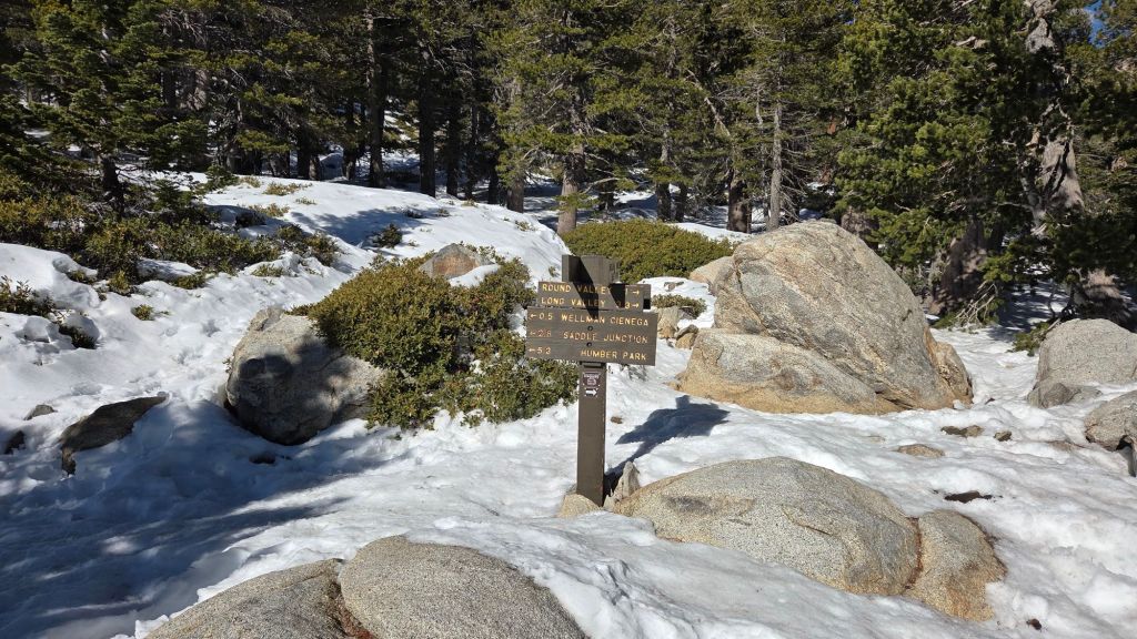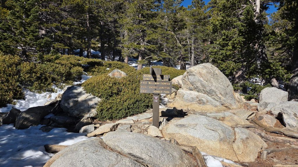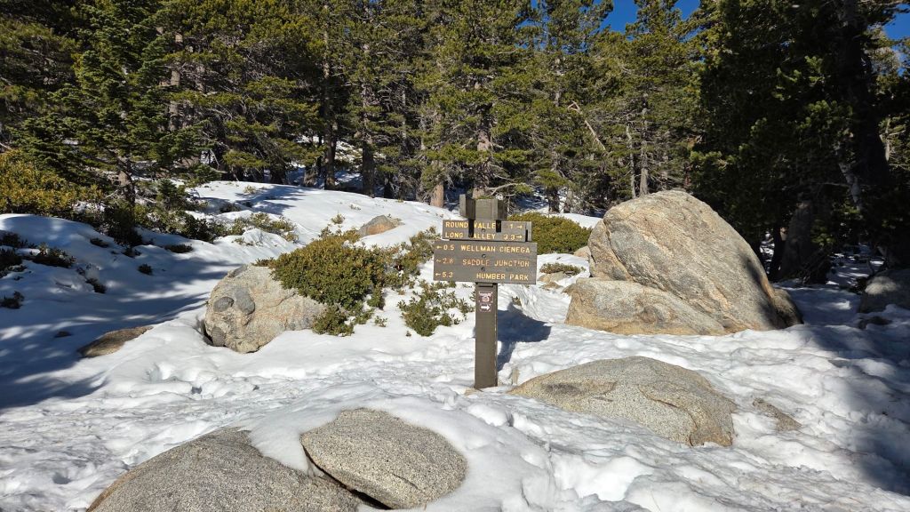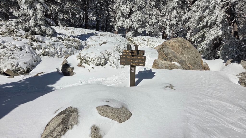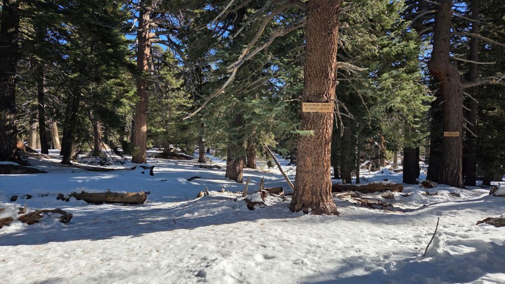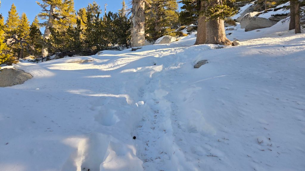 PCT Mile 185.5, the southern end of Fuller Ridge Trail where it splits from Deer Springs Trail, early morning 15th December 2025. Deer Springs Trail (to the right) has a well-worn, compacted track with significant snow-free patches developing, while Fuller Ridge Trail (left) has a rather lightly-traveled posthole track only.