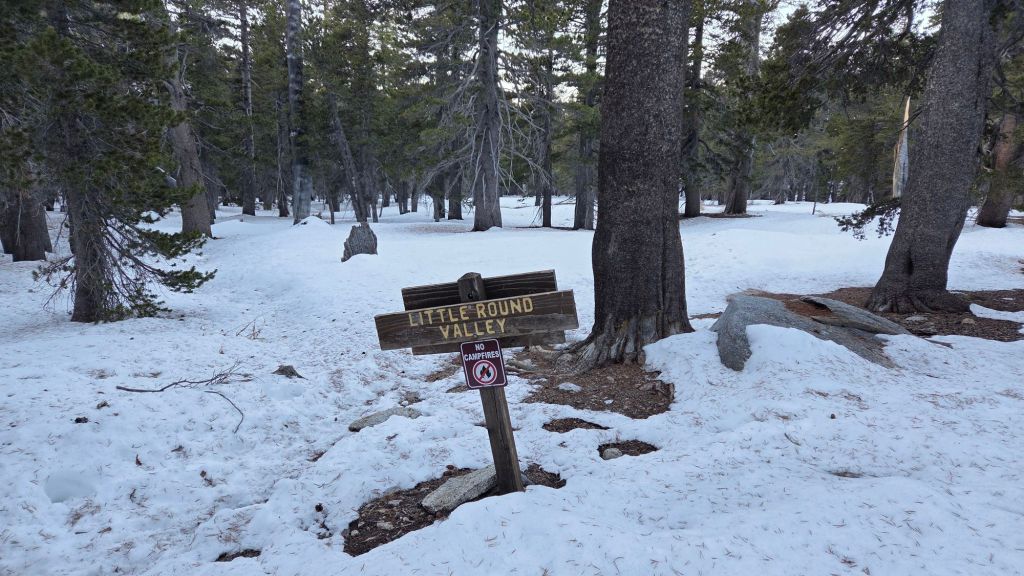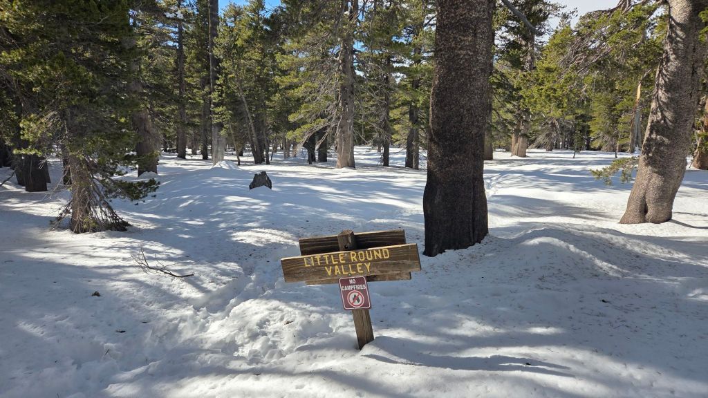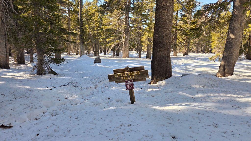 Upper Little Round Valley (9800 ft) with a reasonable posthole track (lower left) through typical depths of 5-7 inches of snow, 9th December 2025.