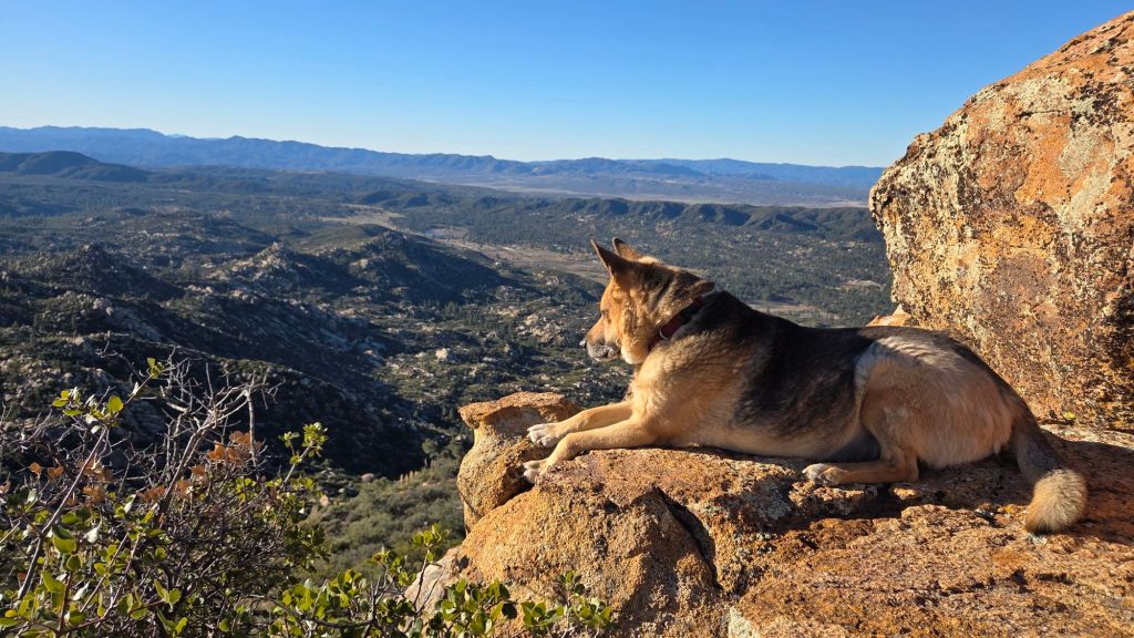 Be rattlesnake aware. Above about 5000 ft elevation, the venom of Southern Pacific Rattlesnakes (Crotalus [oreganus] helleri) in the San Jacinto mountains is predominantly neurotoxic, almost always fatal for dogs and sometimes for humans (see my detailed article linked here for further information describing our dogs’ survival after a July 2020 neurotoxic bite). Devil’s Slide Trail, lower Deer Springs and lower Marion Mountain trails, Suicide Rock, near Strawberry Cienega, and trails around Tahquitz Peak are frequent locations for sightings, but rattlesnakes have been recorded widely up to 9350 ft (see photos below).
