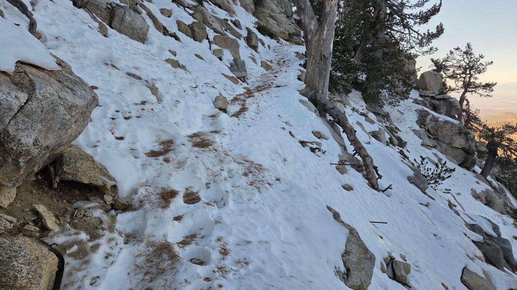 The 0.4 mile section of South Ridge Trail that crosses the north face of Tahquitz Peak from Chinquapin Flat has a well-traveled track through largely continuous icy snow, being expertly traversed by Anabel, early morning 20th December 2025. Spikes remain useful, but even with traction devices this route may not be a comfortable option for all hikers.