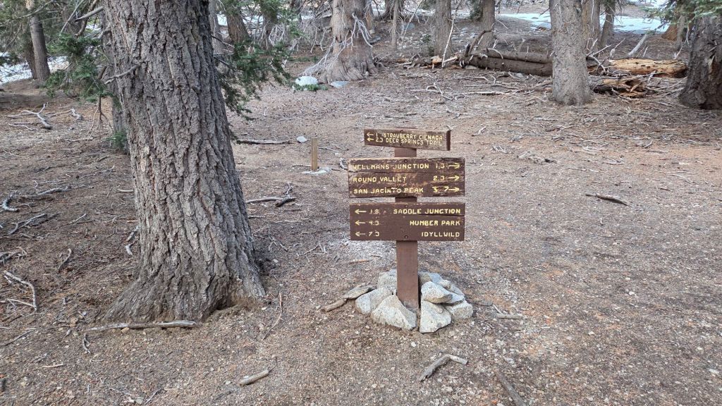 Deer Springs Trail is functionally clear of snow to Strawberry Junction. Snow is very thin and increasingly patchy from there to about 8500 ft (just south of the Marion Mountain Trail junction), but then largely continuous thereafter through to San Jacinto Peak. Snow will become increasingly patchy next week both above and below Little Round Valley, but due to differential drifting and sun exposure, snow will remain several inches deep in most of Little Round Valley for the next week or so. Hikers will find spikes are useful on the upper trail, especially for descending from the Peak to below Little Round Valley.