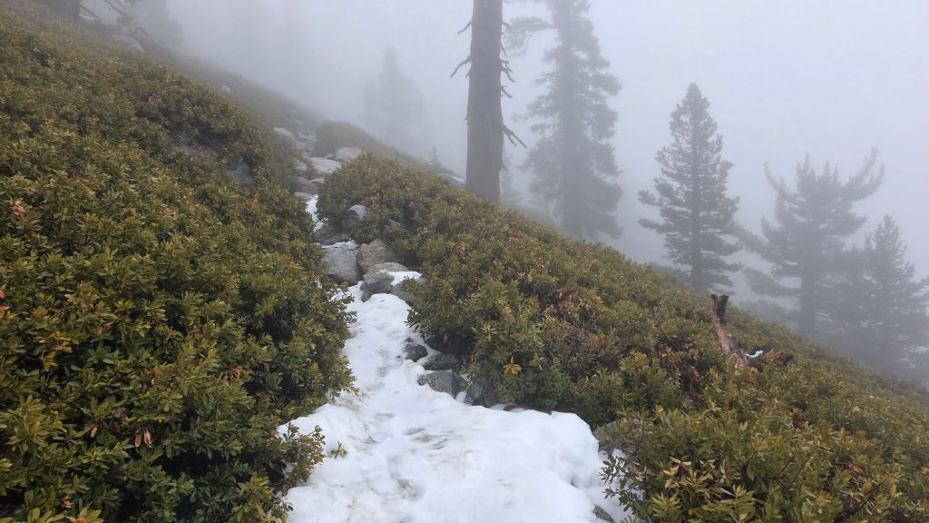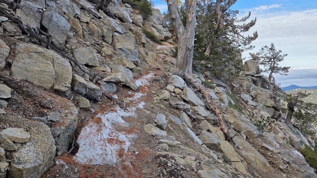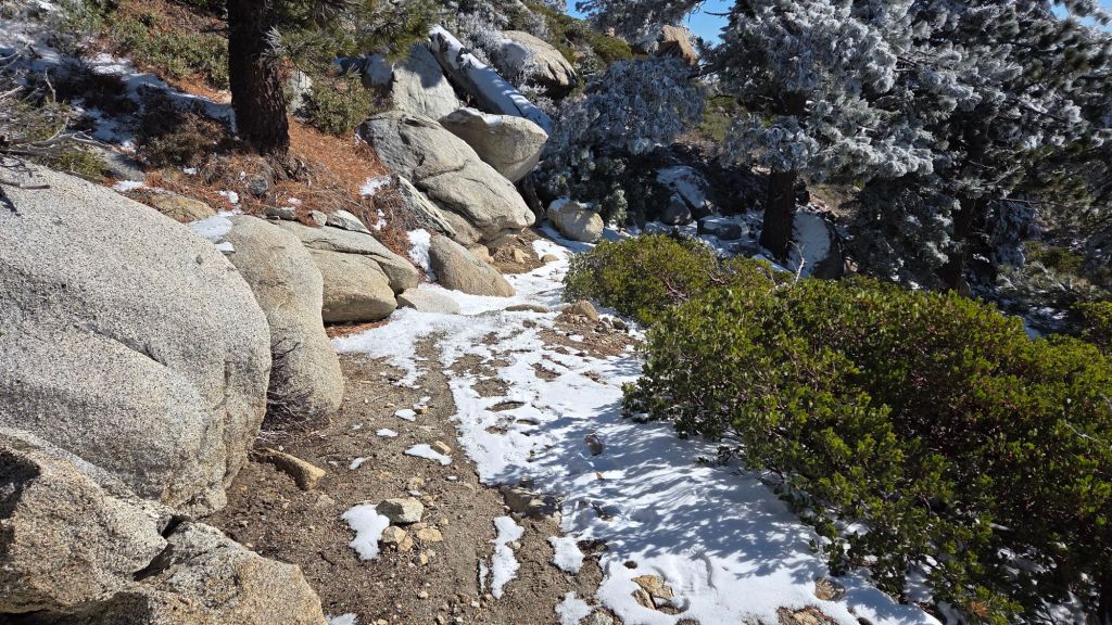 The Peak Trail has an obvious track through very thin continuous snow cover that accurately follows the trail route to the Summit Junction with Deer Springs Trail, and then onward up to San Jacinto Peak. The snow is extremely icy in mornings and in areas that are not sun-exposed. Spikes recommended.