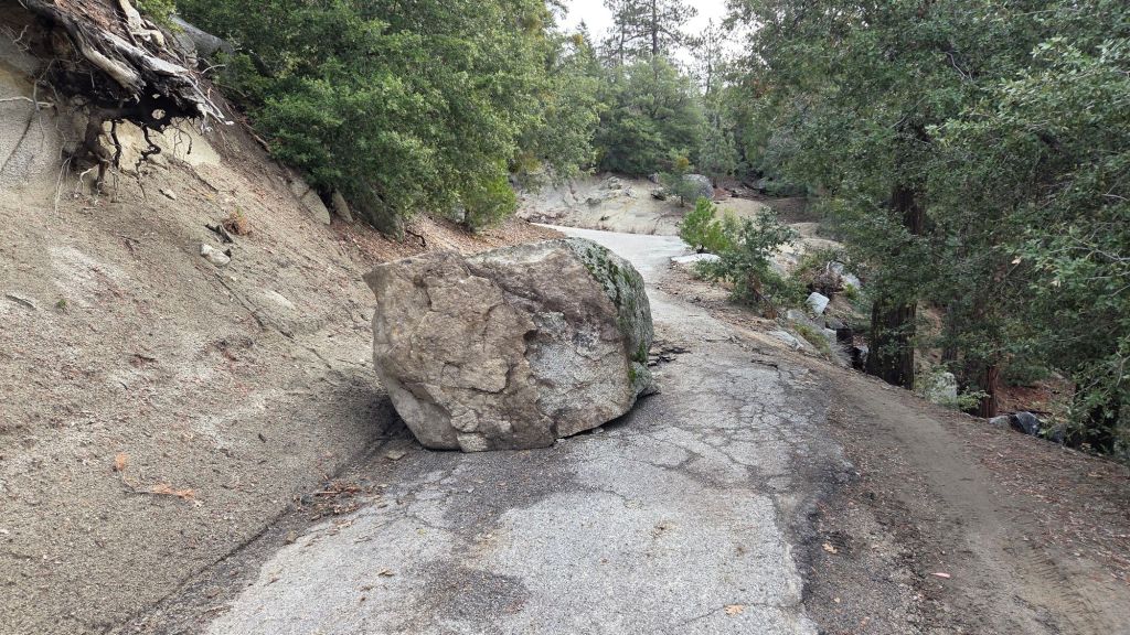 The Peak Trail immediately above Wellman Divide, mid morning 31st December 2025, rapidly transitioning from admixed snow and ice into a channel of slush under steady, mild rain. This snow and ice was almost entirely washed away by 2nd January.Above, the Peak Trail looking north at 9800 ft, early morning 2nd January 2026, with everything, including the remnant snow in the trail, plastered with ice from freezing rain the previous day. Below, the same view, with a thin coating of about 1.5 inches of fresh snow, mid morning 27th December 2025.Above and below, Wellman Divide (9700 ft). Above, with an average depth of one inch of snow, mid morning 27th December 2025, having been completely snow-free the day before. Below, early morning 2nd January 2026, with almost all snow washed away by heavy rain over the previous two days.The 0.4 mile section of South Ridge Trail that crosses the north face of Tahquitz Peak from Chinquapin Flat has very limited patchy icy snow remaining, early morning 3rd January 2026. Spikes are no longer required.South Ridge Road is closed for the foreseeable future following a landslide that included this rather obstructive boulder, 3rd January 2026.