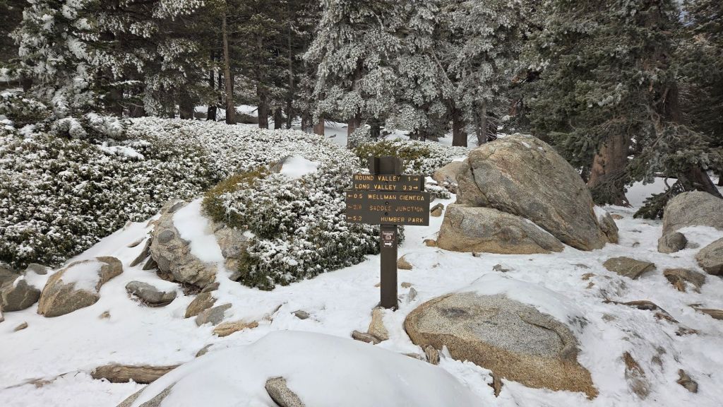 There were fresh tracks to follow on South Ridge, Wellman, Peak, Deer Springs, and Marion Mountain trails, plus the PCT from Miles 177-181, as early as the afternoon of Monday 5th. There is now also a reliable track to follow through very thin snow on the Round Valley Trail from Long Valley to Wellman Divide.
