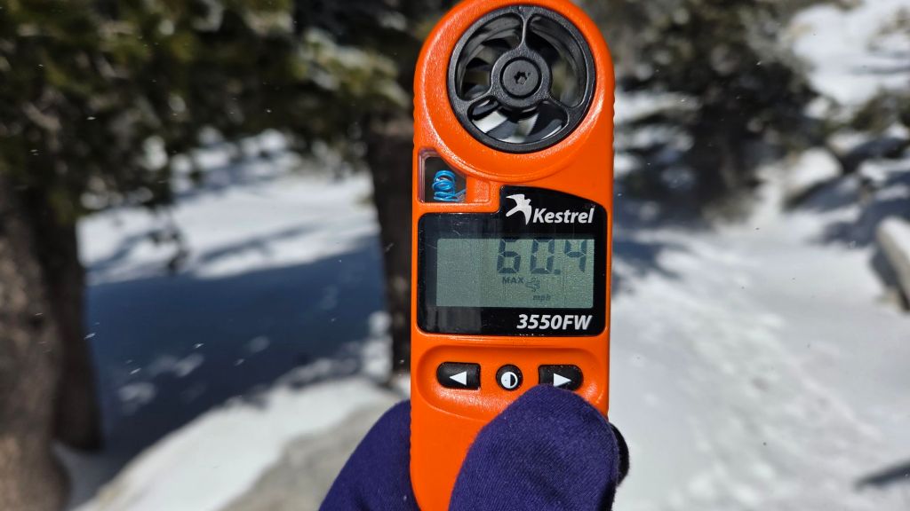 At San Jacinto Peak (10,811ft/3295m) on Thursday 8th January 2026 at 0945 the air temperature was 16.9°F (-8°C), with a windchill temperature of -12.3°F (-25°C), 63% relative humidity, and a record-breaking WNW wind sustained at 44 mph gusting to 60.4 mph. The latter was a record wind gust for winter at the Peak (photo below), and the former an all-time record for sustained wind speed that I have recorded at the Peak.