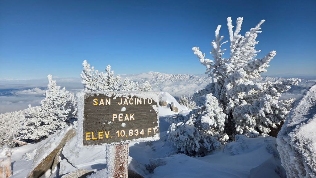 To date this has been the second poorest winter on record for snow in the high country (following the desperately dry 2024/25). Snow persisting from storms in November has largely gone from the high country, although what little remains (generally >10,000 ft) is now icy and treacherous in places following months of freeze/thaw cycles. It was unprecedented that thePacific Crest Trail was clear of snow throughout the San Jacinto mountains at the end of January. The lightest dusting of snow on 5th February – just 0.25 inch above 9900 ft – made conditions even more treacherous at highest elevations, albeit only for a day.