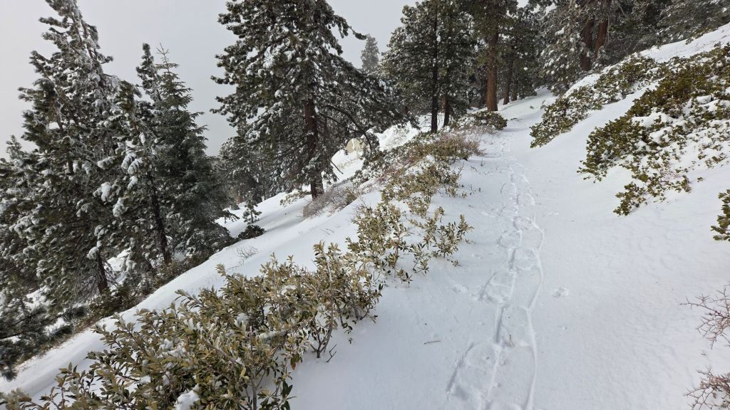 The Peak Trail at 10,500 ft with my tracks breaking trail through an inch of fresh snow on top of a few remaining inches of icy snow, the latter persisting mainly only in the trail, early morning 23rd January 2026.