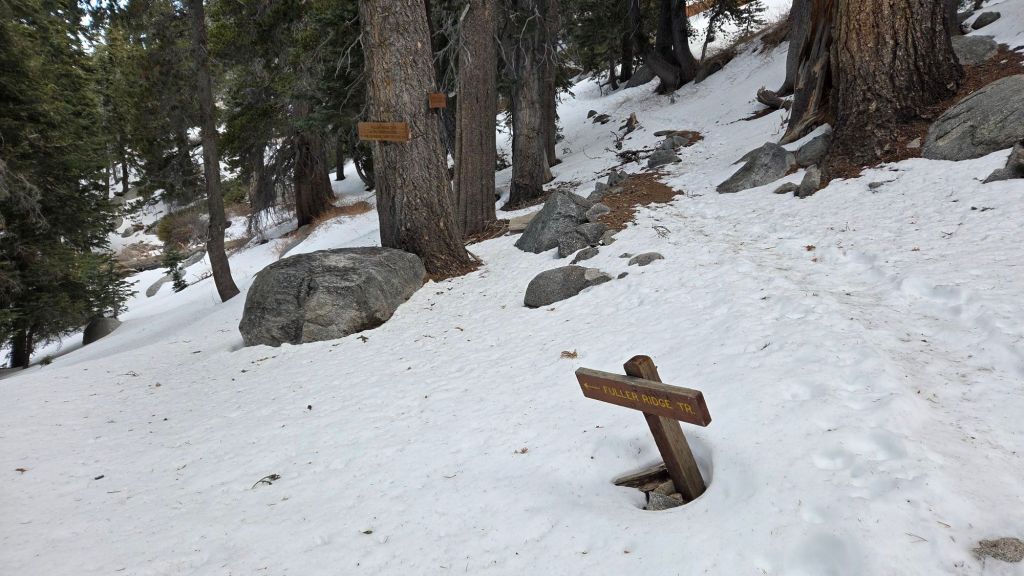 As of 7th March there were no visible tracks through the discontinuous snow on Seven Pines Trail or Fuller Ridge Trail (PCT Miles 185.5-190.5), although the latter has been traveled by both nobo and sobo PCT section hikers that I have encountered, largely when snow was too firm to leave obvious tracks.