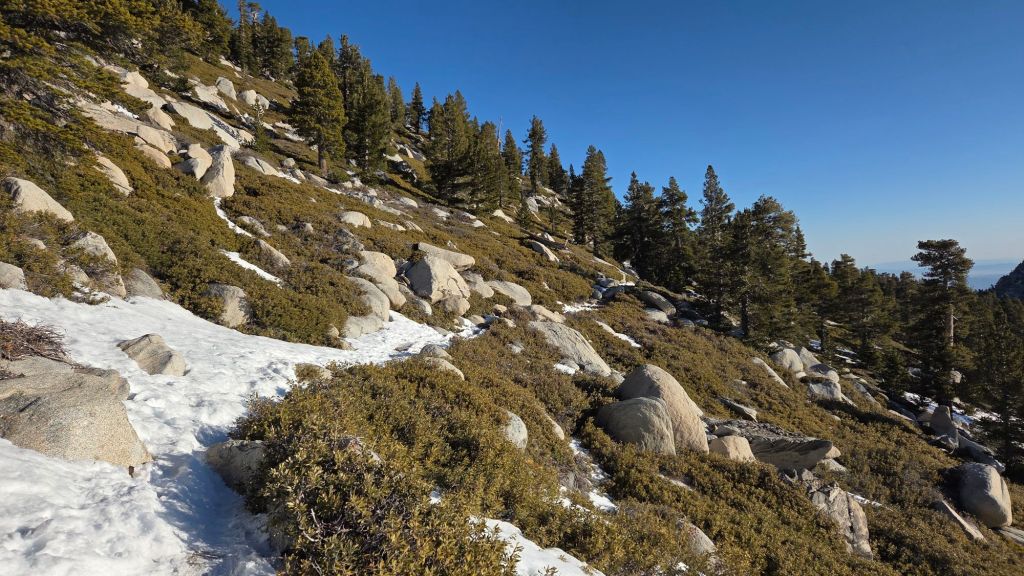 Strawberry Trail (PCT Miles 181-183) [surveyed 6th March] averages 20% snow cover (example photo below).