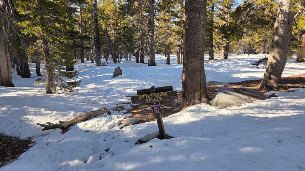 The Round Valley Trail [surveyed 5th March] has a rapidly thinning 40% snow cover to Round Valley, and thereafter a well-traveled posthole track through 90% snow cover to Wellman Divide.