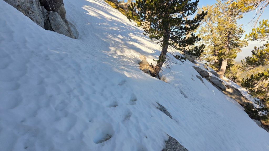 The 0.4 mile section of South Ridge Trail from Chinquapin Flat to Tahquitz Peak [surveyed 3rd March] currently has only a very lightly-traveled single posthole track to follow through steeply angled icy snow (photo below). The snow is becoming more patchy, and melting will be rapid this week, nevertheless these icy slopes on the north side of Tahquitz Peak are notoriously treacherous. Currently spikes (or preferably crampons) with an ice axe, and the requisite physical and mental skills to use this equipment in high angle terrain, are strongly recommended, but even then this section of trail will not be a comfortable option for most hikers until there is further melting and snow starts to soften over the next few days.