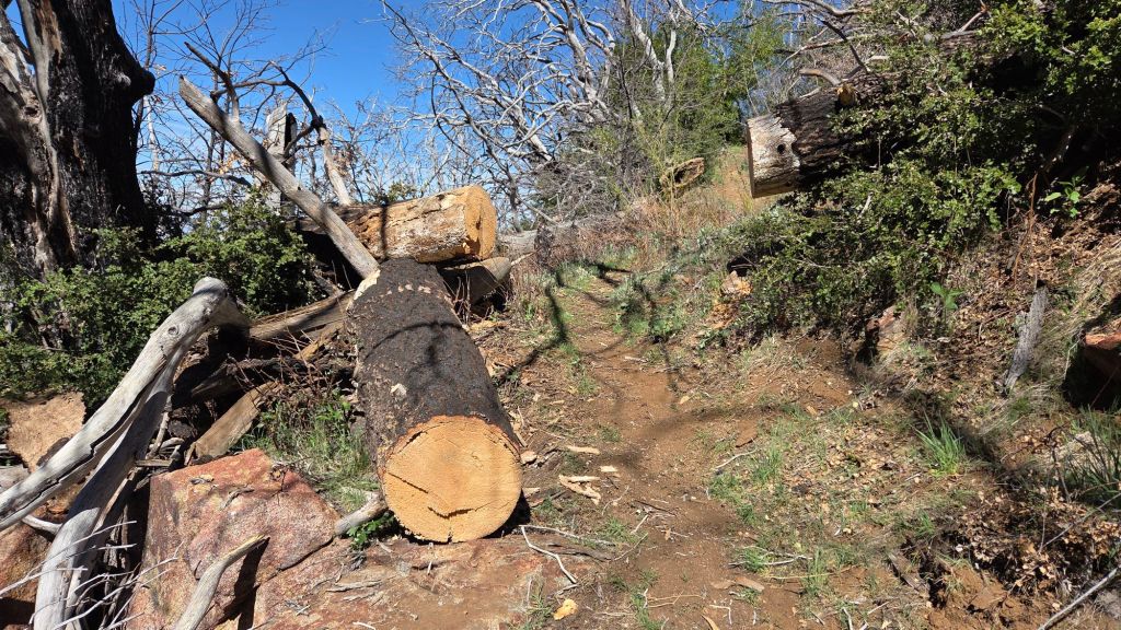 Spitler Peak Trail [surveyed multiple times in March, most recently on 26th] is now clear of treefall hazards, despite having been decimated by about 65 new blowdowns in strong winds that accompanied the mid February storms. In four days of work since late February, the Trail Report cut almost all of these (example photo below), bringing to 235 the number of trees we have removed from this trail in the past seven years. The remaining four large cedars were removed by Forest Service on 31st March.