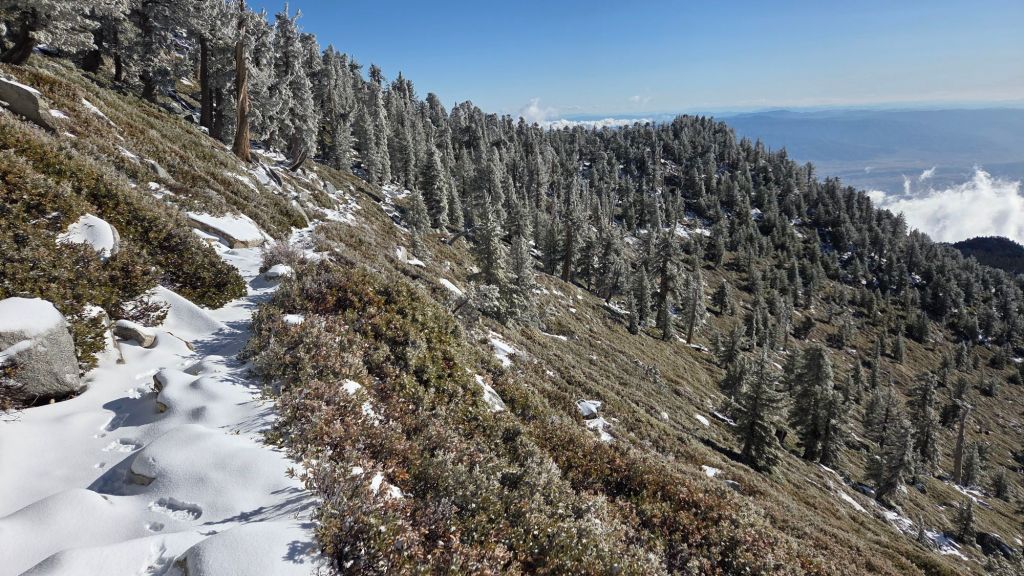 With a couple of very minor exceptions mentioned below, all trails are now snow-free. Traction devices are no longer required on the trail system, although hikers venturing off-trail to 10,000+ ft peaks other than San Jacinto may find spikes useful for the next few days as remnant north slope snow fields firm up in the colder conditions.
