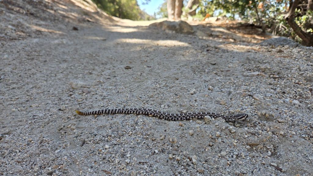 A very young juvenile Southern Pacific Rattlesnake at 6700 ft on Devil’s Slide Trail, late morning 7th April 2026. This individual was only nine inches long, and very sluggish in the shade on a relatively cool morning, The patterning of all juveniles resembles the lowland population, but then the montane population becomes largely blackish by their third year.