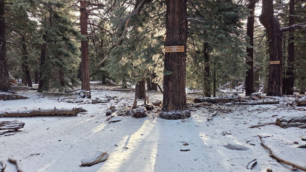 An informal use trail to Laws is much more direct, generally well maintained, and avoids the bushwhacking of the abandoned trails (some local Idyllwild hikers dubbed it the “King Trail” when I established the route in 2019). It leaves Willow Creek Trail exactly 1.0 mile from Saddle Junction, 0.46 mile from the Skunk Cabbage turning (trailhead at N 33.7796, W 116.6590). The route descends following former deer trails for 1.2 miles, meeting Willow Creek about 0.15 mile upstream from the site of the historic Laws Camp (the remains of which were destroyed by the 2013 Mountain Fire and subsequent flood and treefall damage). One huge pine tree fell in late 2024 across the King Trail about midway down that requires a minor scramble underneath, but most additional blowdowns from this winter have already been removed. There is some optimism that the Forest Service, in collaboration with the Trail Report and other volunteers, will work to rehabilitate the former Caramba Trail in 2026, likely starting with the lower section from Laws down to Caramba camp. If you see any flagging in this area please leave it in place.