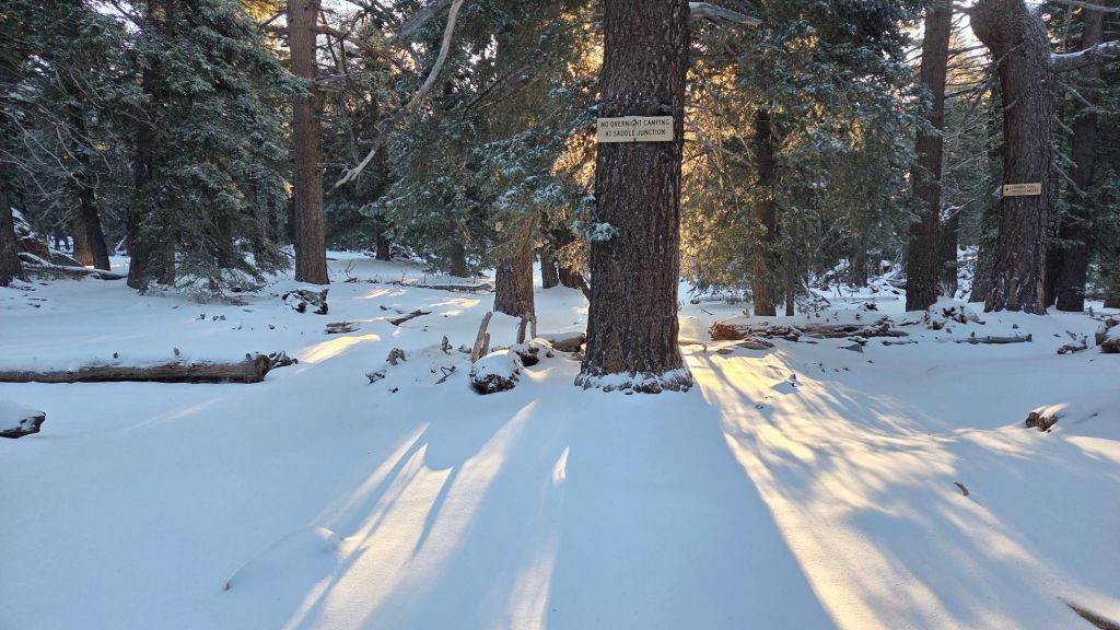 UPDATE Tuesday 14th April 2026 at 0730: brief update from San Jacinto Peak. Snow and hail yesterday evening dusted down to 5000 ft. I broke trail this morning from Devil’s Slide Trail to the Peak, and measured 1.5 inches of snow at Humber Park, 2.5 inches at Saddle Junction, three inches at 8500-9500 ft, but only 2.5 inches above 10,000 ft. Snow is soft and thin and most hikers will find spikes are not required at present. Melting will be very rapid on sun-exposed slopes today. I will have put in a fresh track on Deer Springs Trail by early afternoon, and hope to have a more detailed update to the Trail Report by this evening.