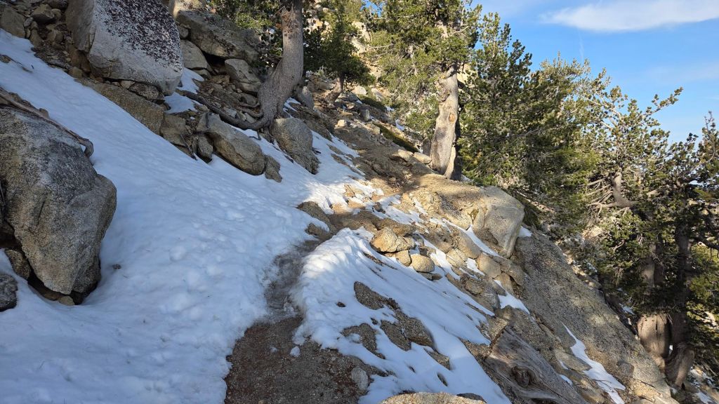 No significant patches of snow remain on the exposed section of South Ridge Trail on the north side of Tahquitz Peak, early morning 19th April 2026.