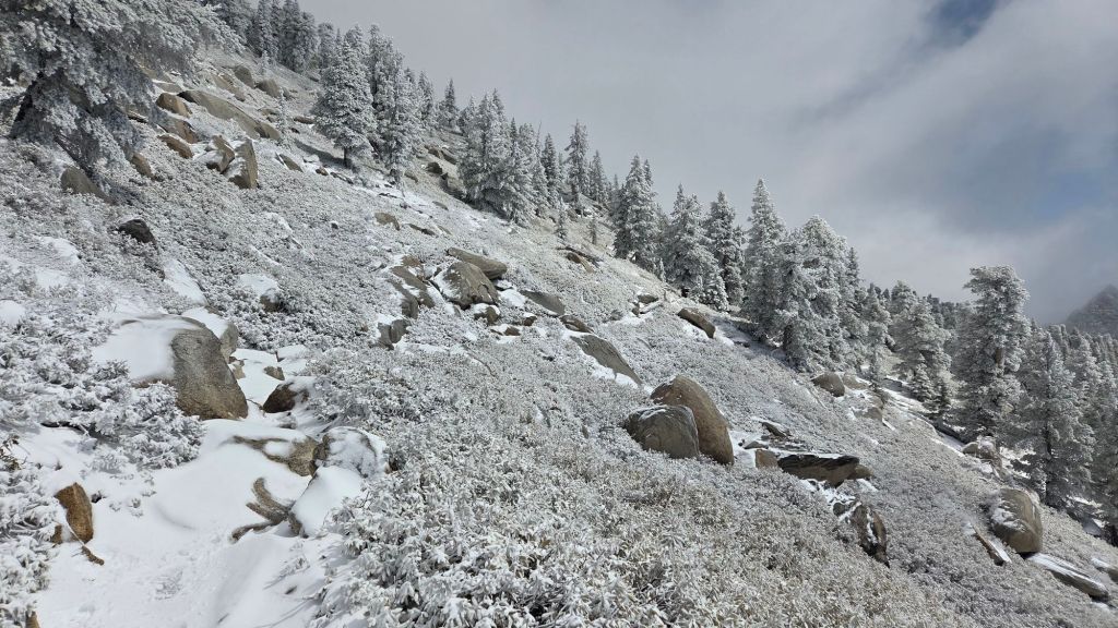 I broke trail on the morning of 14th from Devil’s Slide Trail to San Jacinto Peak, and measured 1.5 inches of snow at Humber Park (6500 ft), 2.5 inches at Saddle Junction (8100 ft), three inches throughout 8500-9500 ft, but only 2.5 inches above 10,000 ft. I recorded a short video report late morning on Tuesday 14th at San Jacinto Peak (linked here).