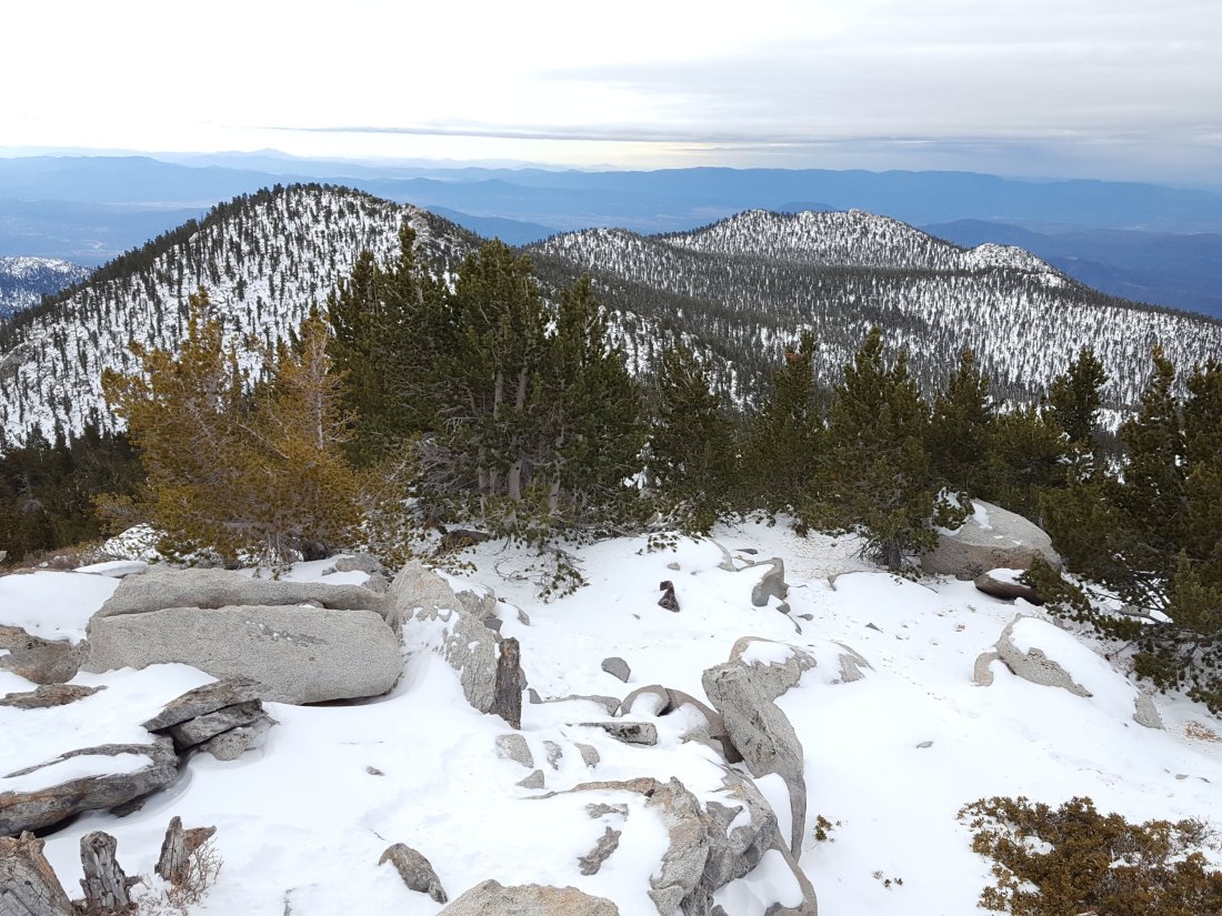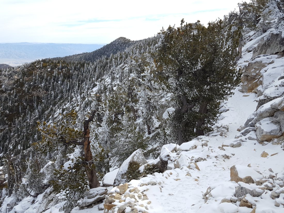 Deer Springs Trail has been very lightly traveled since the snow on Christmas Day. Snow depth is at about 12″ in Little Round Valley, with deeper drifts nearer San Jacinto Peak. There is no consolidated trail between Little Round Valley and San Jacinto Peak, with tracks of just 2-3 people, and these do not approximate to the trail. Snowshoes or mountaineering boots are recommended from Little Round Valley up.