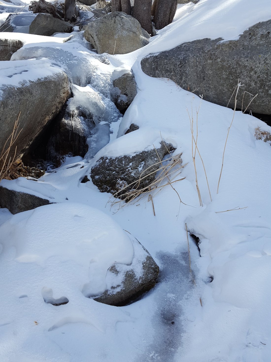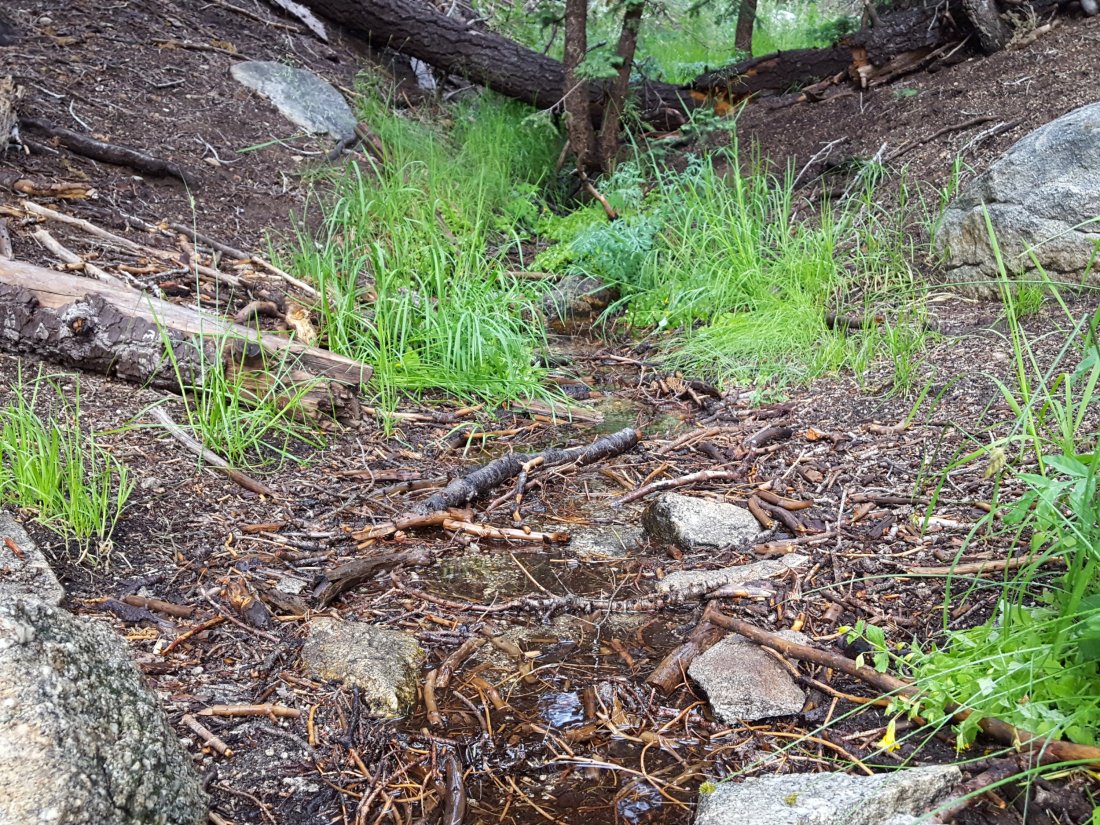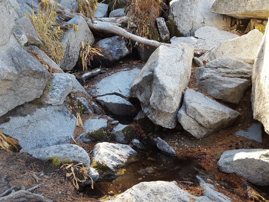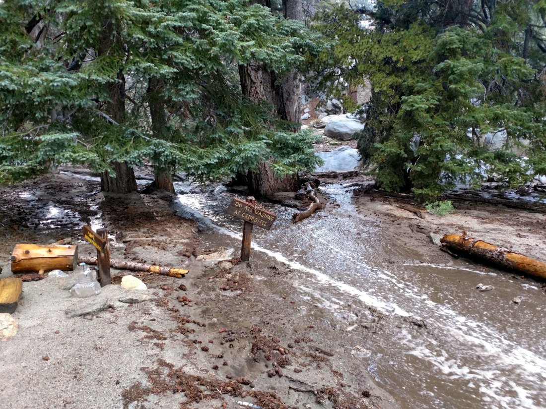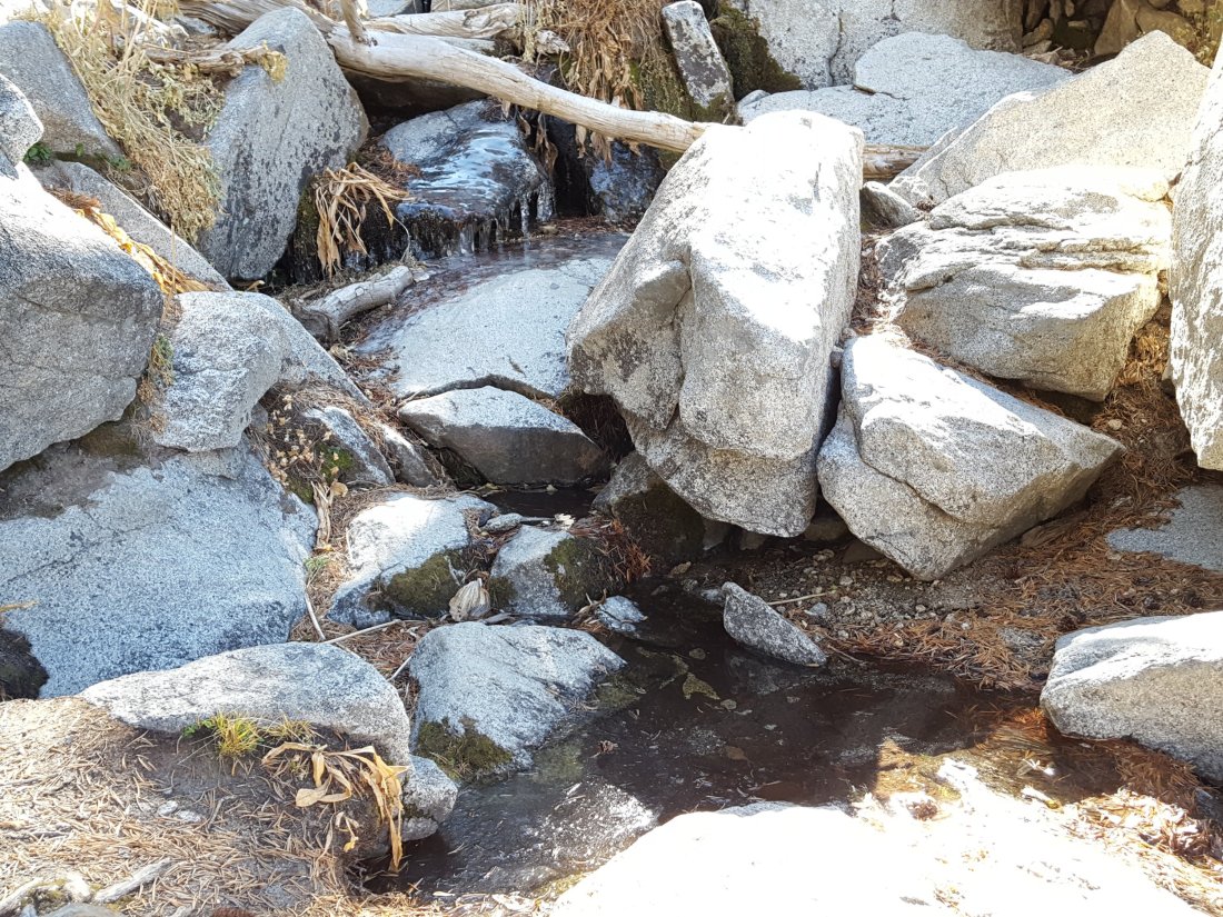 Water The only concern with water right now is that most sources above 8500′ are frozen solid. This will remain a problem, especially in the mornings, for at least the next several days. For example at the crossing of the North Fork of the San Jacinto River on Fuller Ridge today at noon, I was unable to kick through several inches of solid ice with a hiking boot heel to reach the flowing trickle underneath (see photo below).