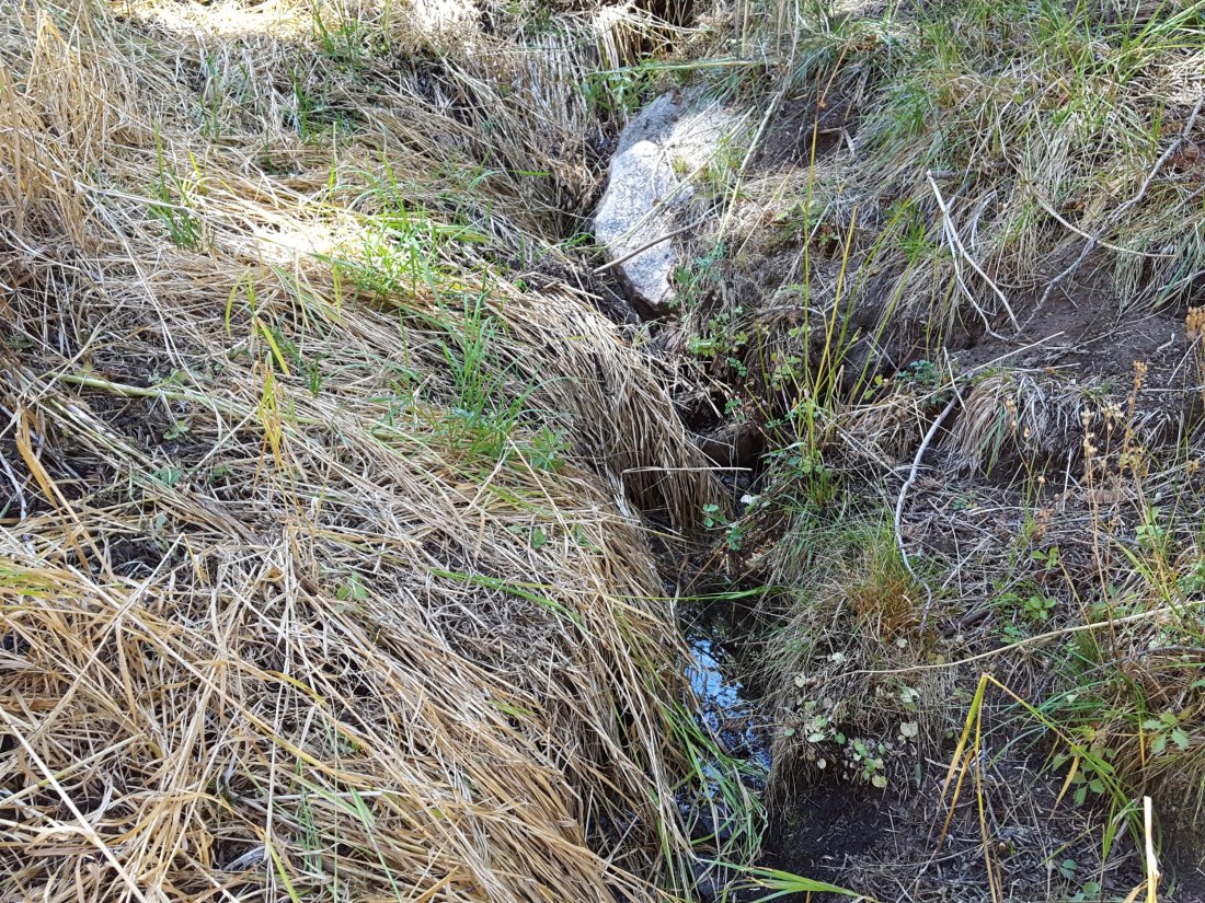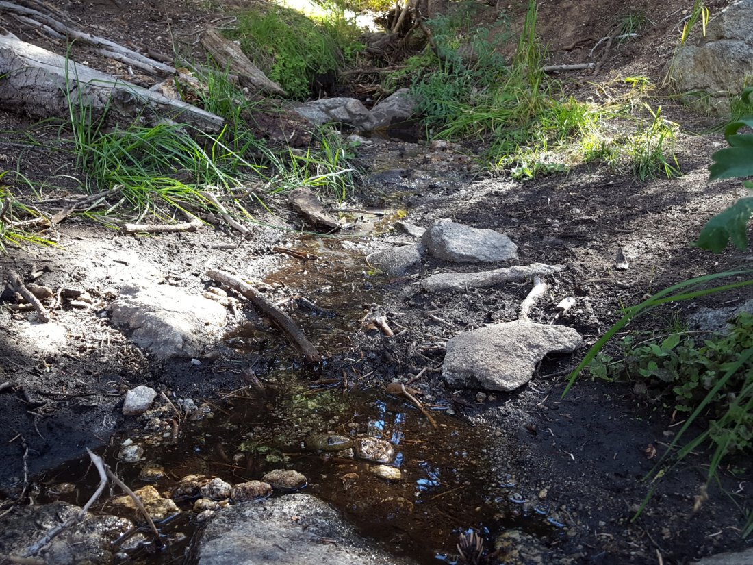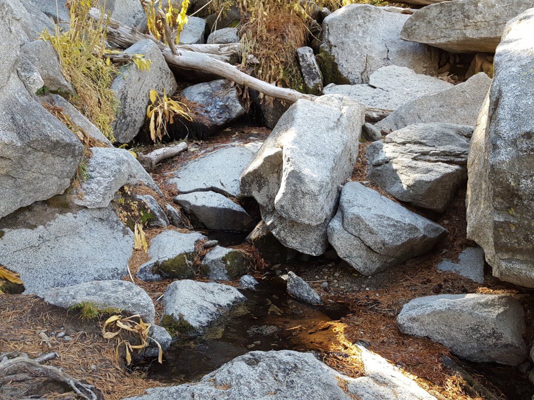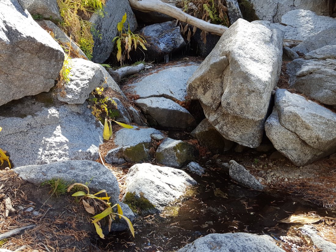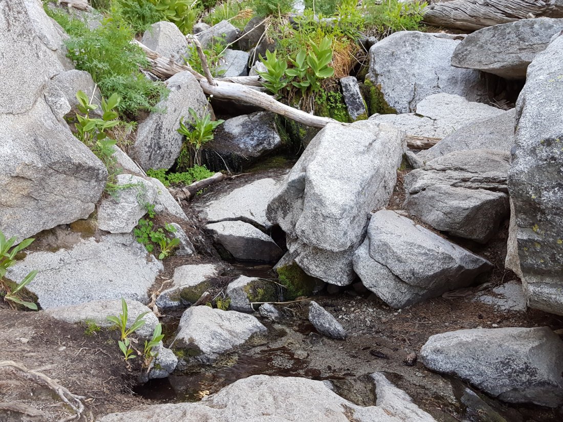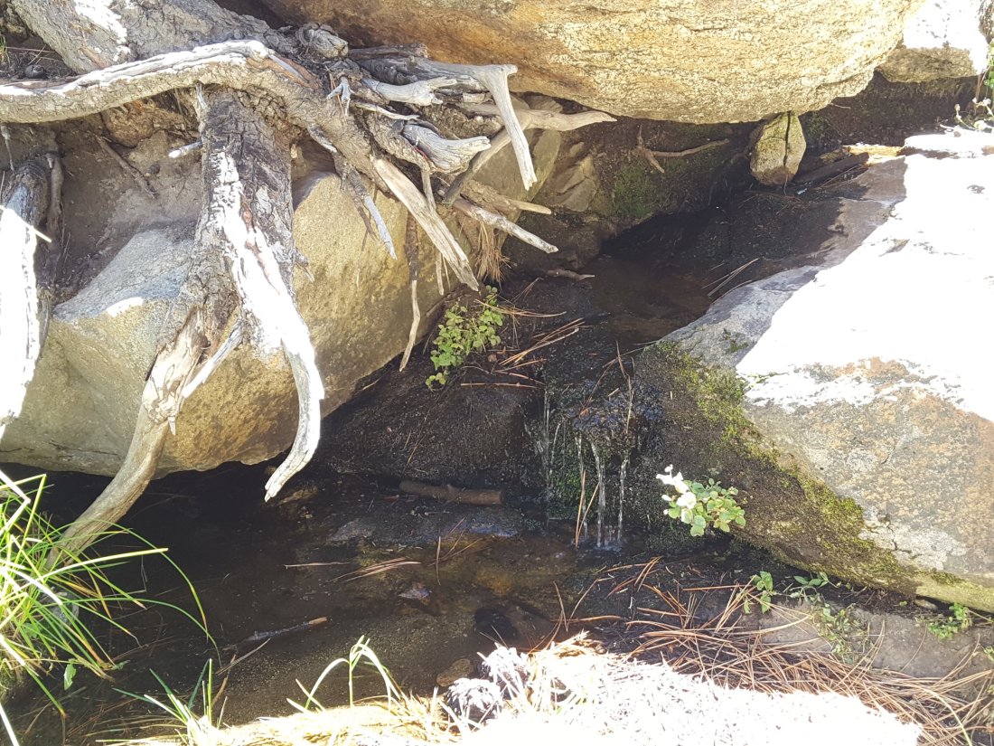 Water The only concern with water right now is that most sources above 8500′ are frozen solid. This will remain a problem, especially in the mornings, for at least the next several days. For example at the crossing of the North Fork of the San Jacinto River on Fuller Ridge today at noon, I was unable to kick through several inches of solid ice with a hiking boot heel to reach the flowing trickle underneath (see photo below).