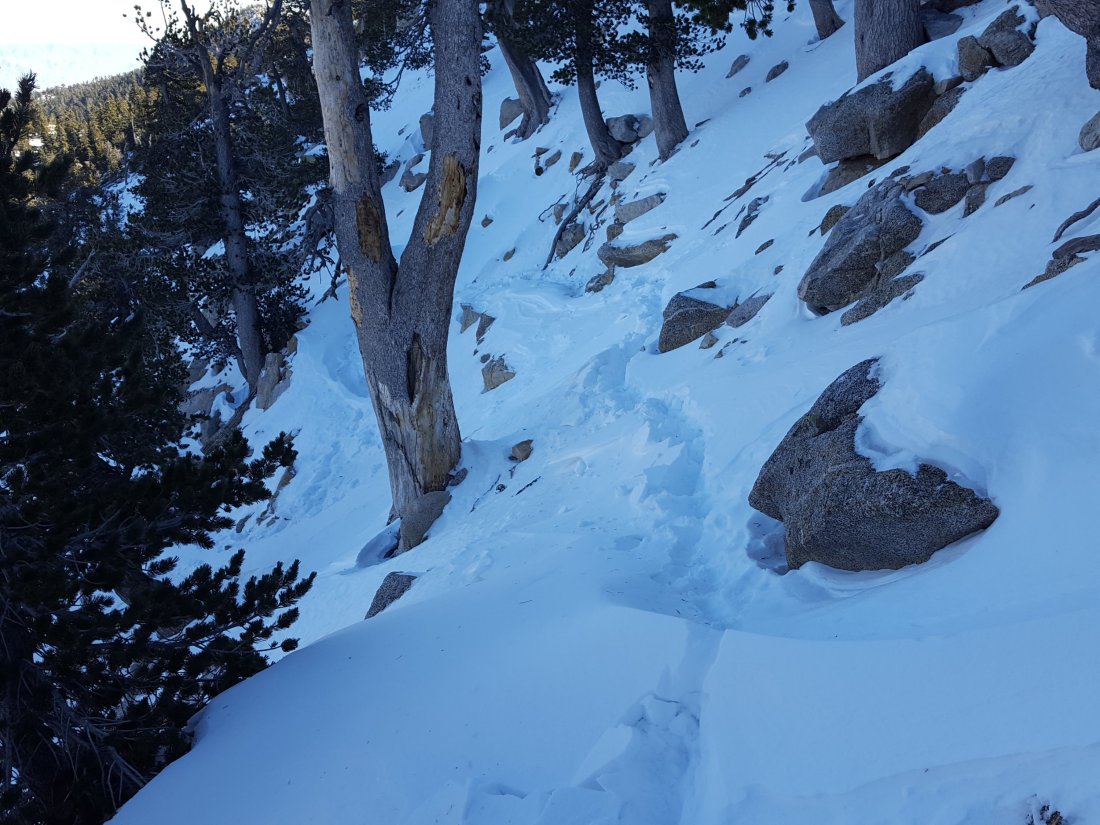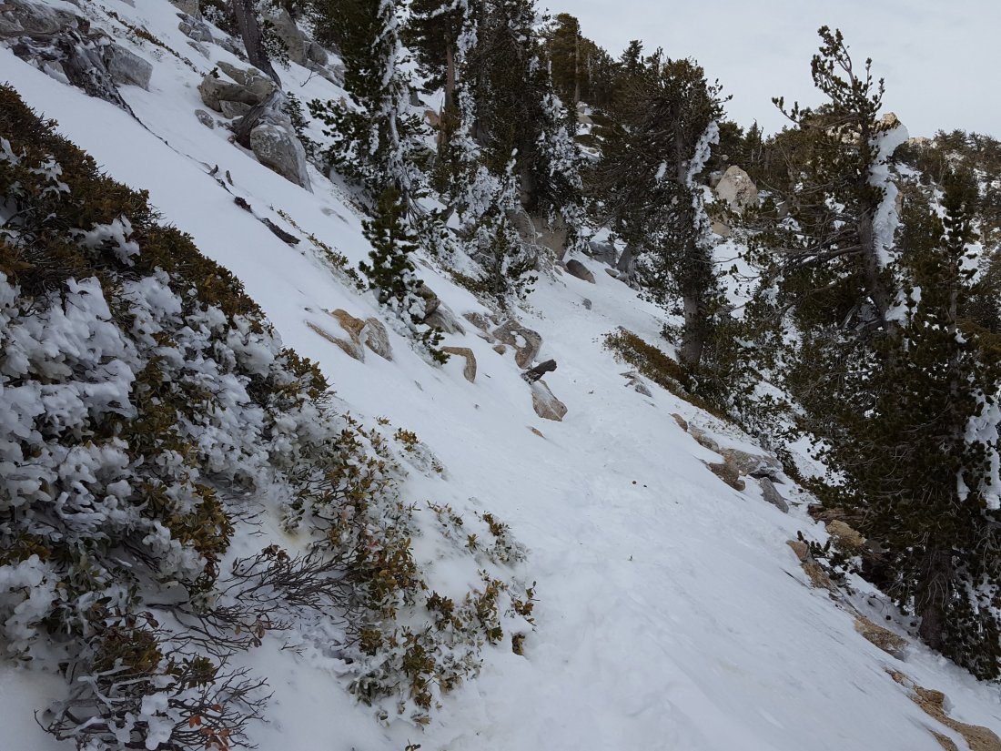 Overview We have had three light dustings of snow this week, on Monday (discussed in previous post), yesterday, and briefly this morning. Combined these have produced a fairly consistent maximum of 2″ (5cm) of snow across the mountain above about 8000′, and above 6500′ about 1″ or even less. However very strong winds have resulted in extensive drifting, especially accumulating in trails. The uppermost parts of the mountain were above most of the cloud, and have also only received about 2″ of fresh snow, although here drifting has been extreme, especially on the east side of San Jacinto Peak. Although traction aids (e.g., microspikes) are not currently essential, I would now recommend them in a couple of specific areas (discussed below), and as always, hikers unfamiliar with snow/ice travel may find microspikes useful in many areas. Three notable hazards at present are discussed first.