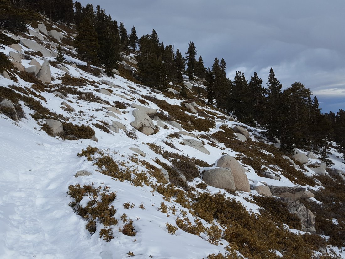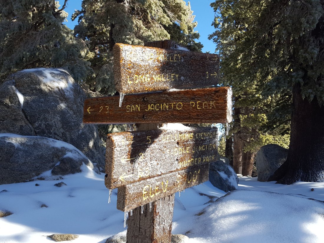 Pacific Crest Trail While much of the PCT through the San Jacinto Mountains is currently covered with a little snow (<1″), the route is relatively easy to follow. By this afternoon, the snow from the morning was already starting to melt on some sections on exposed southerly aspects (e.g., near Strawberry Cienega). Hikers very unfamiliar with snow/ice travel will find microspikes useful in some areas. Please also see comments above regarding severe cold, water problems, and additional forecast snow.