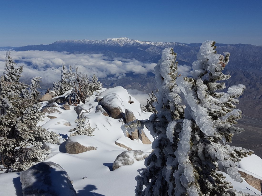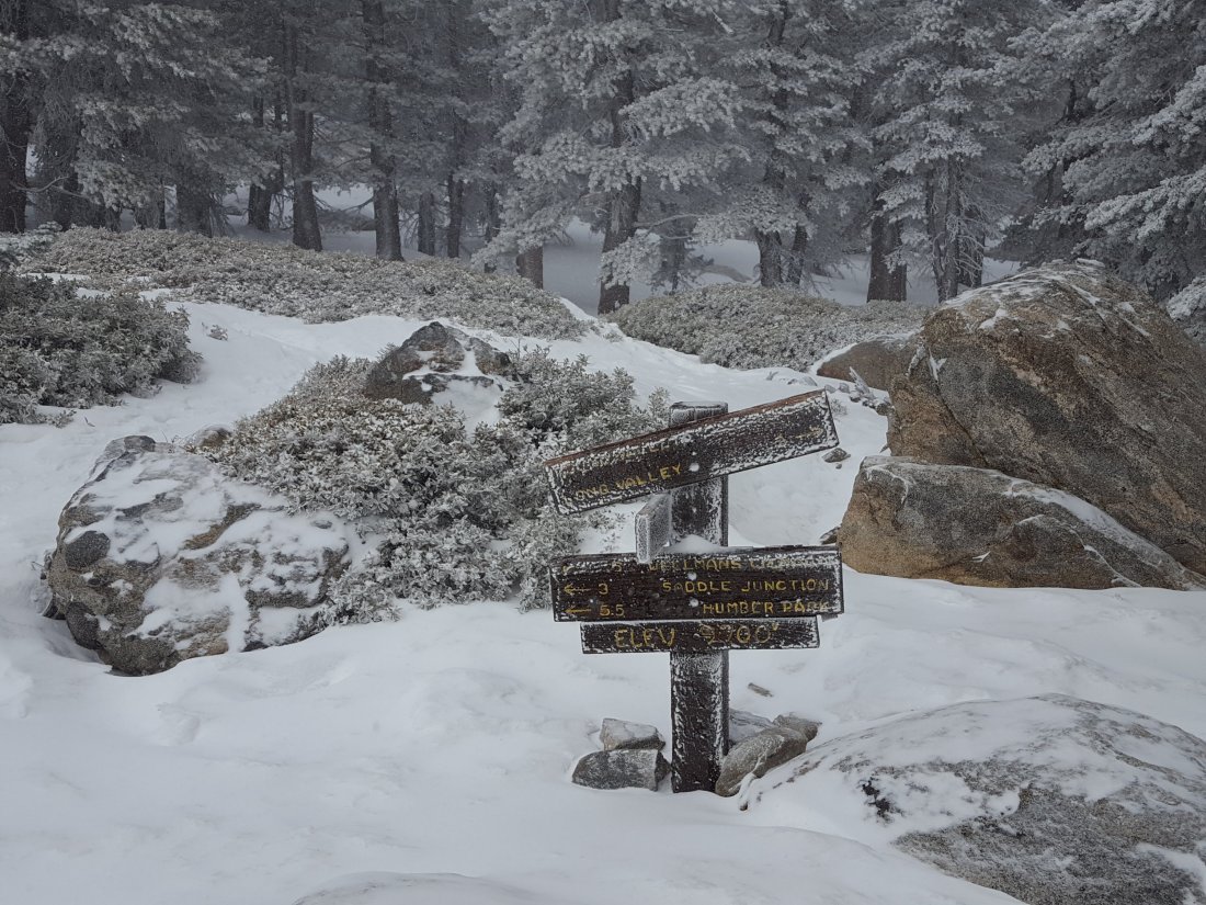 Just a brief update prior to a more comprehensive posting tomorrow afternoon. This morning we hiked to San Jacinto Peak from Humber Park, for what was my 126th ascent of the calendar year. On the way up we left the lower elevation cloud behind around 9000′, but it returned and started lightly snowing on us at about 10,000′ elevation. Snowfall at the Peak was erratic, with the cloud level right around 10,800′, and after we left we could see the high country bathed in sunshine again.