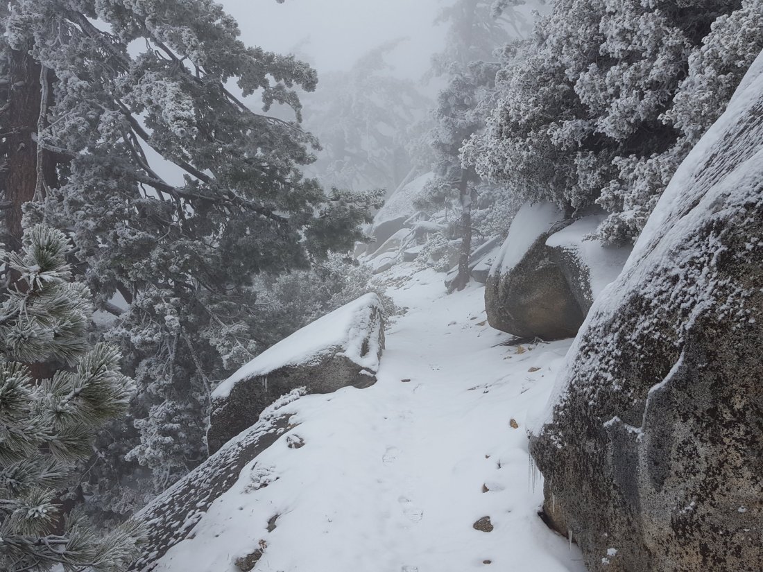 We have had three minor snow storms in the past three days. However they have produced so little snow that there is currently no change to the trail conditions from the 9 Feb update. In fact the highest elevations have been largely above the cloud, so there has been more melting than accumulation. For example today I was easily able to ascend and descend San Jacinto Peak without using microspikes. Nevertheless, those unfamiliar with snow/ice travel may continue to find spikes useful in places (as discussed in the 9 Feb update). Further precipitation is forecast for 18-19 Feb, and overnight temperatures are forecast to be well below freezing at higher elevations in the mountains for at least the next 10 days.