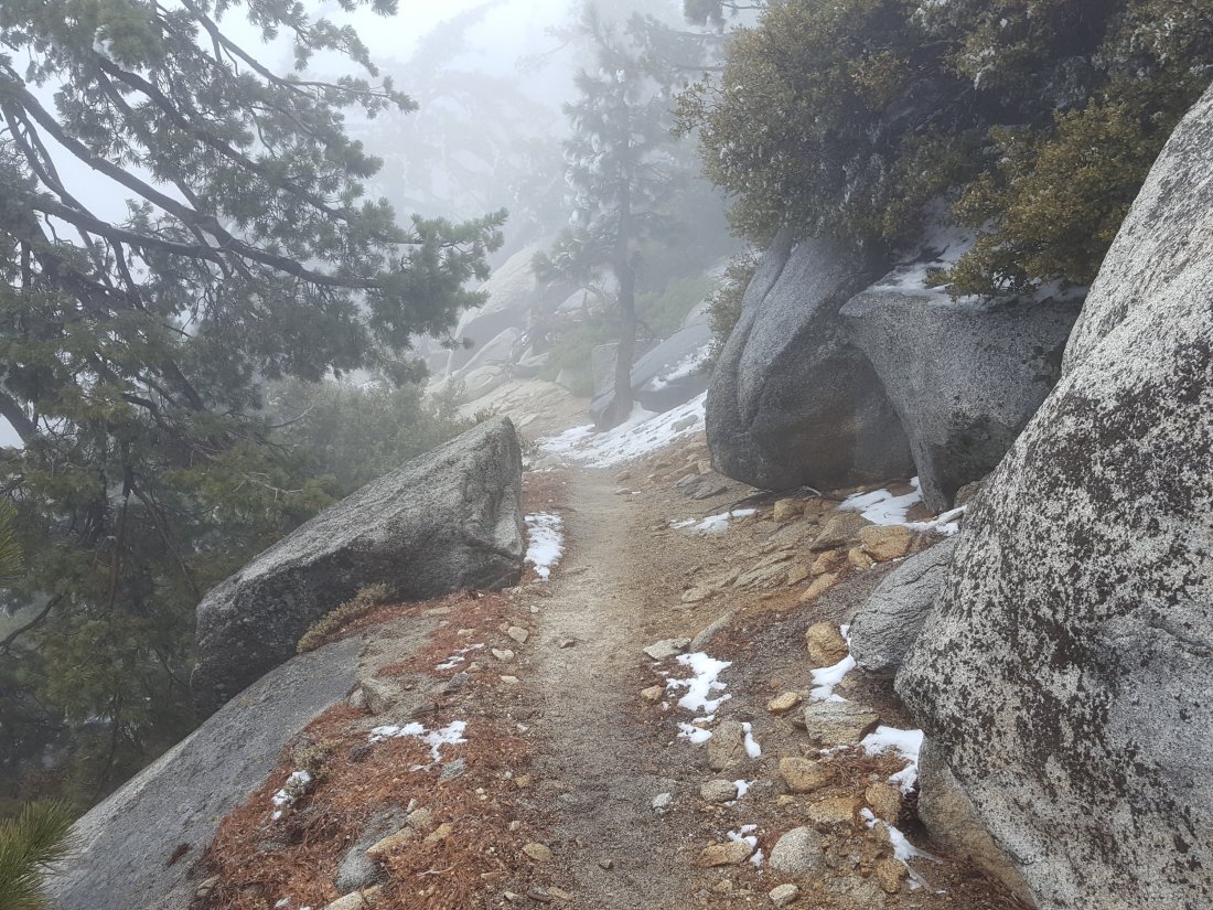 South Ridge Trail Clear from South Ridge Road trailhead to Tahquitz Peak, then passable with care to PCT (Chinquapin Flat). Between Tahquitz Peak and Chinquapin Flat there is continuous coverage of compacted snow that requires some care to traverse (microspikes are useful but not essential when heading north from Tahquitz Peak).