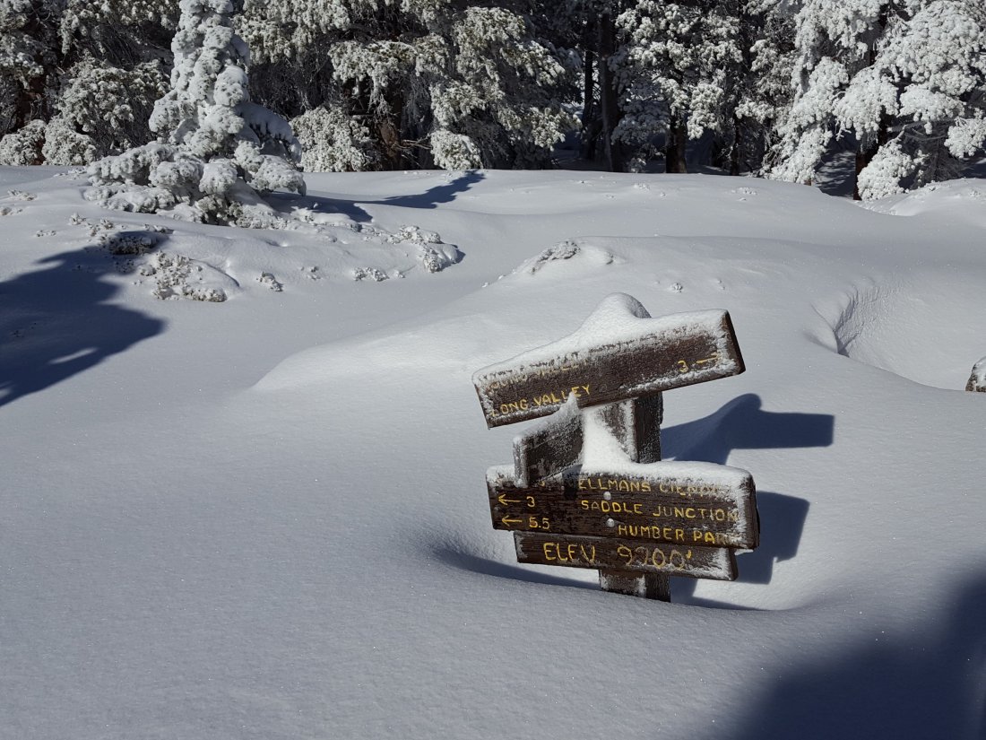 Devils Slide Trail has continuous snow cover averaging about 5″ at both Humber Park (6500′) and at Saddle Junction (8100′).