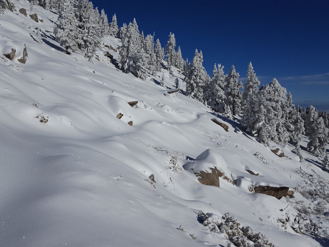 Tahquitz Peak trail from Chinquapin Flat had been very lightly traveled by midday today. Strong winds overnight had left heavy spindrift across the slope, overlaying more solid (and treacherous) icy snow. The spindrift had a very polystyrene quality, and was carving off in small slabs which were collapsing like mini wind slab avalanches downslope. The average snow depth was about 10-12″, however some drifted sections were 20-24″ deep. Until there has been more foot traffic here, crampons (or microspikes if you are very comfortable with their use), in conjunction with hiking poles or preferably an ice axe, are strongly recommended. [I would discourage carrying an ice axe if you aren’t familiar with how to use it.]