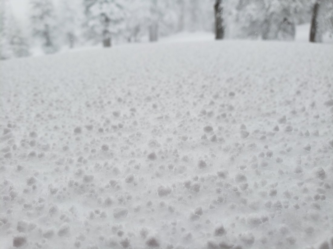 Newly fallen graupel sitting on top of earlier snow, San Jacinto Peak, at 1245 on 29th November 2019.