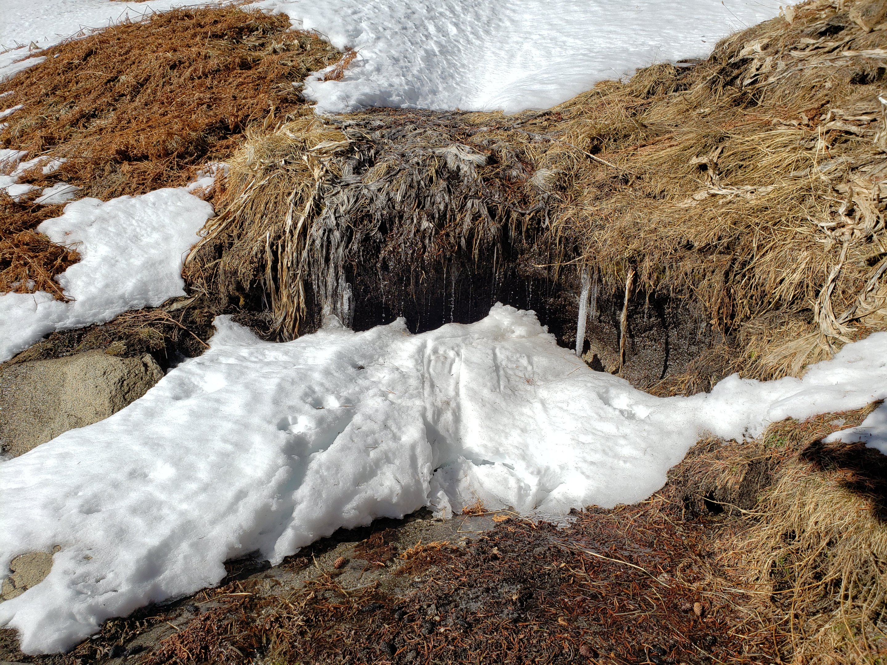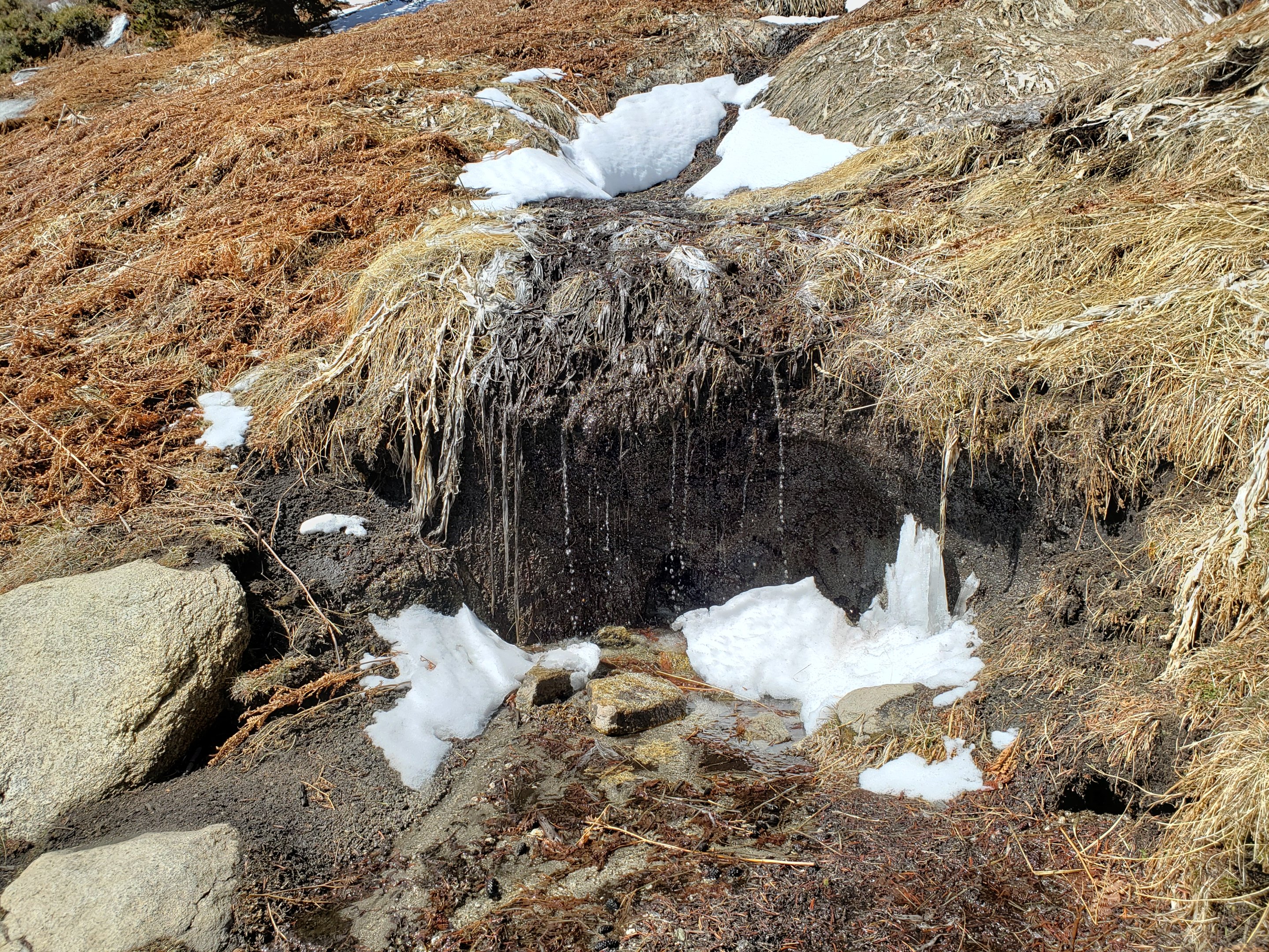 A month of freeze-thaw cycles, plus compaction by hiker traffic, has left the limited patches of snow very icy on high country trails. Consequently it is still advised to carry spikes for all trails above about 8000′ elevation, which all have some patches of ice and compacted icy snow, as described in detail below. Although often not required for ascending, spikes can be helpful for descending icy sections of trails, depending upon your comfort level on ice and icy compacted snow. No new snow depth data are given here, as almost all measurements average 1-2″ at most.