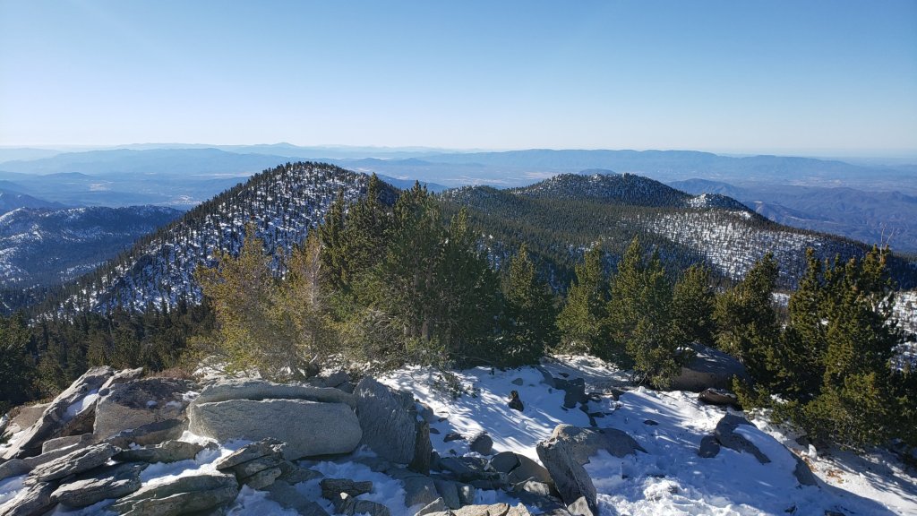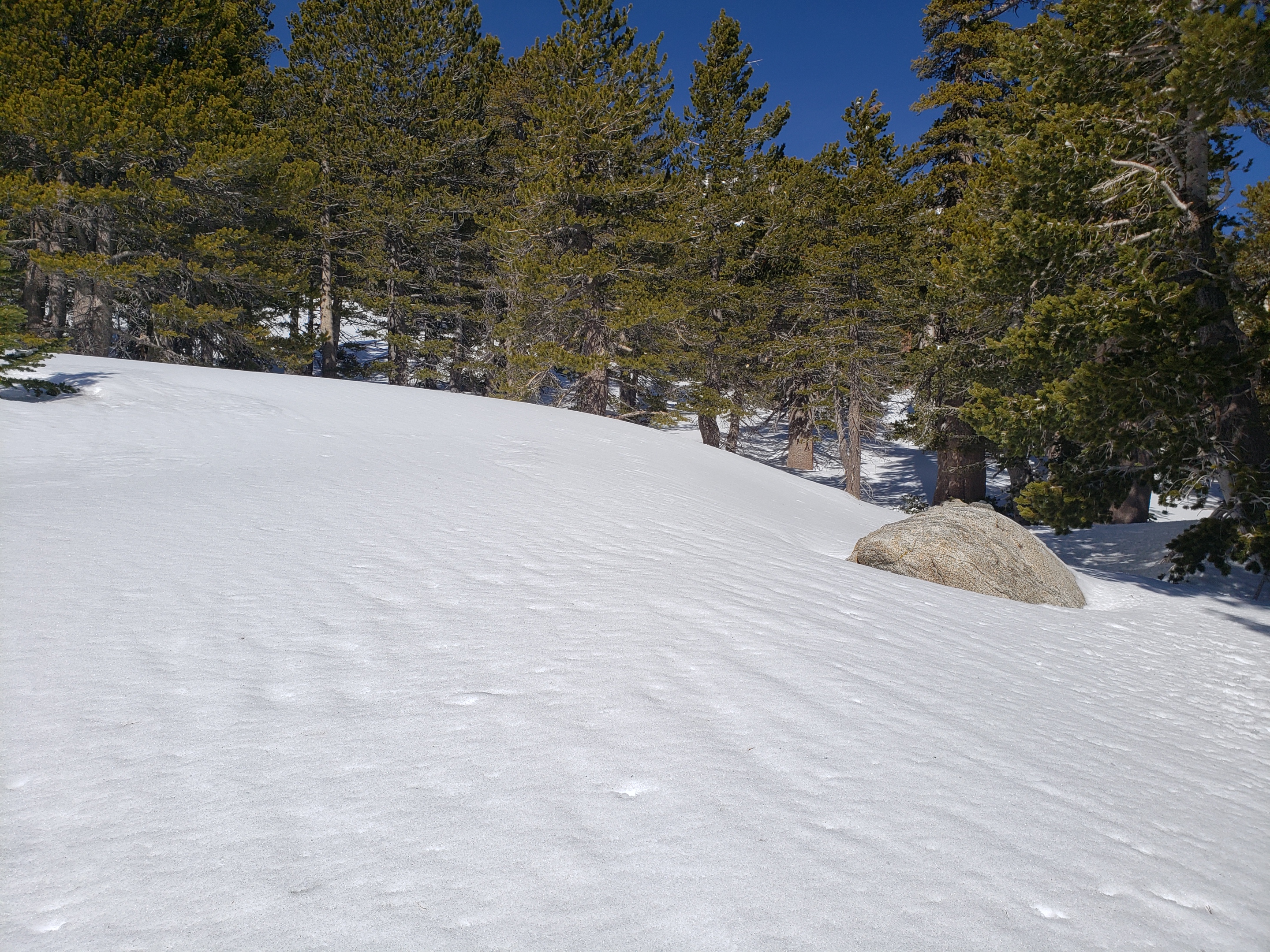 The East Ridge Trail between Miller and San Jacinto peaks remains 90% snow-covered, ranging from 1-6″ deep. There are reasonable tracks to follow.