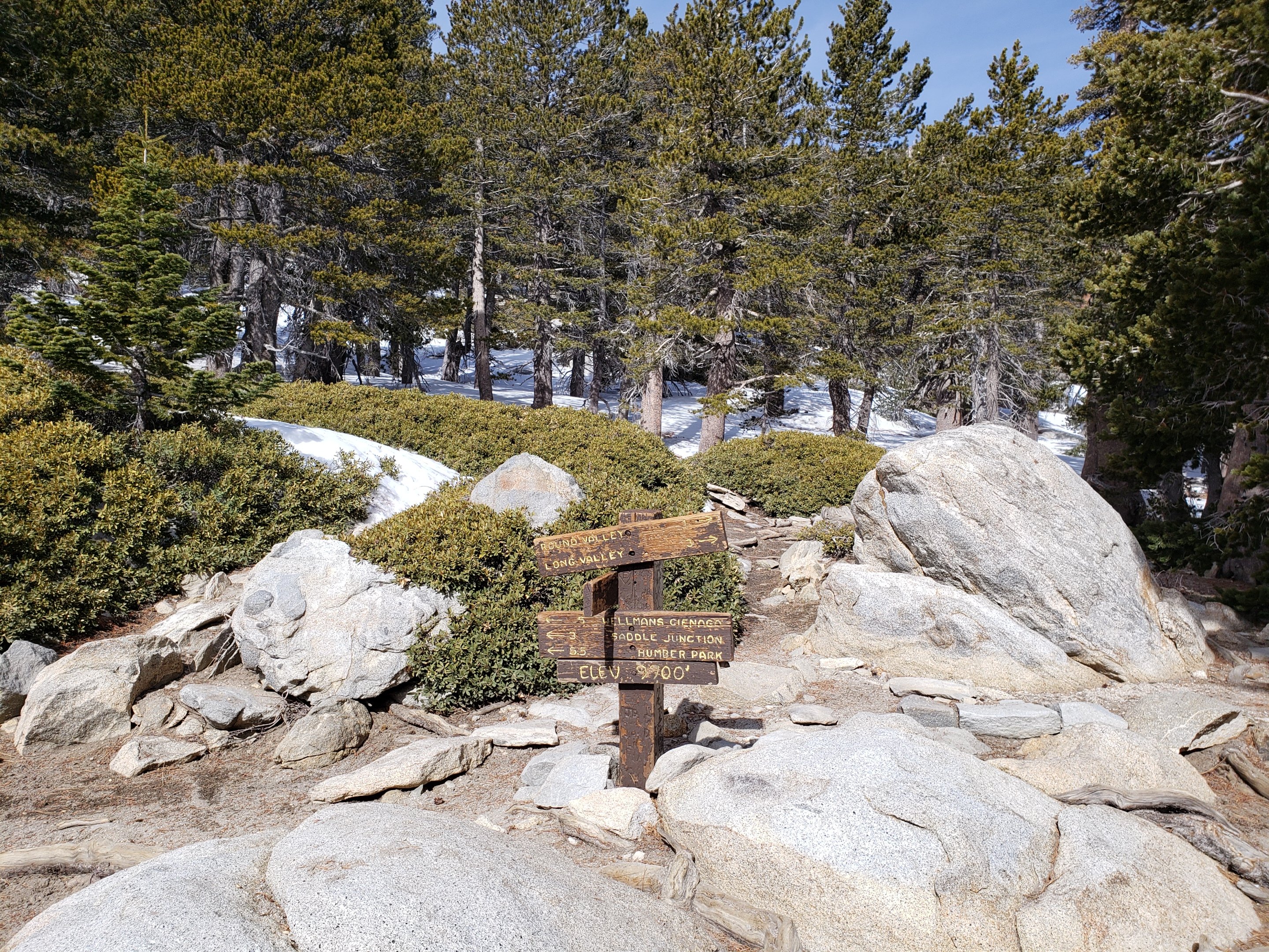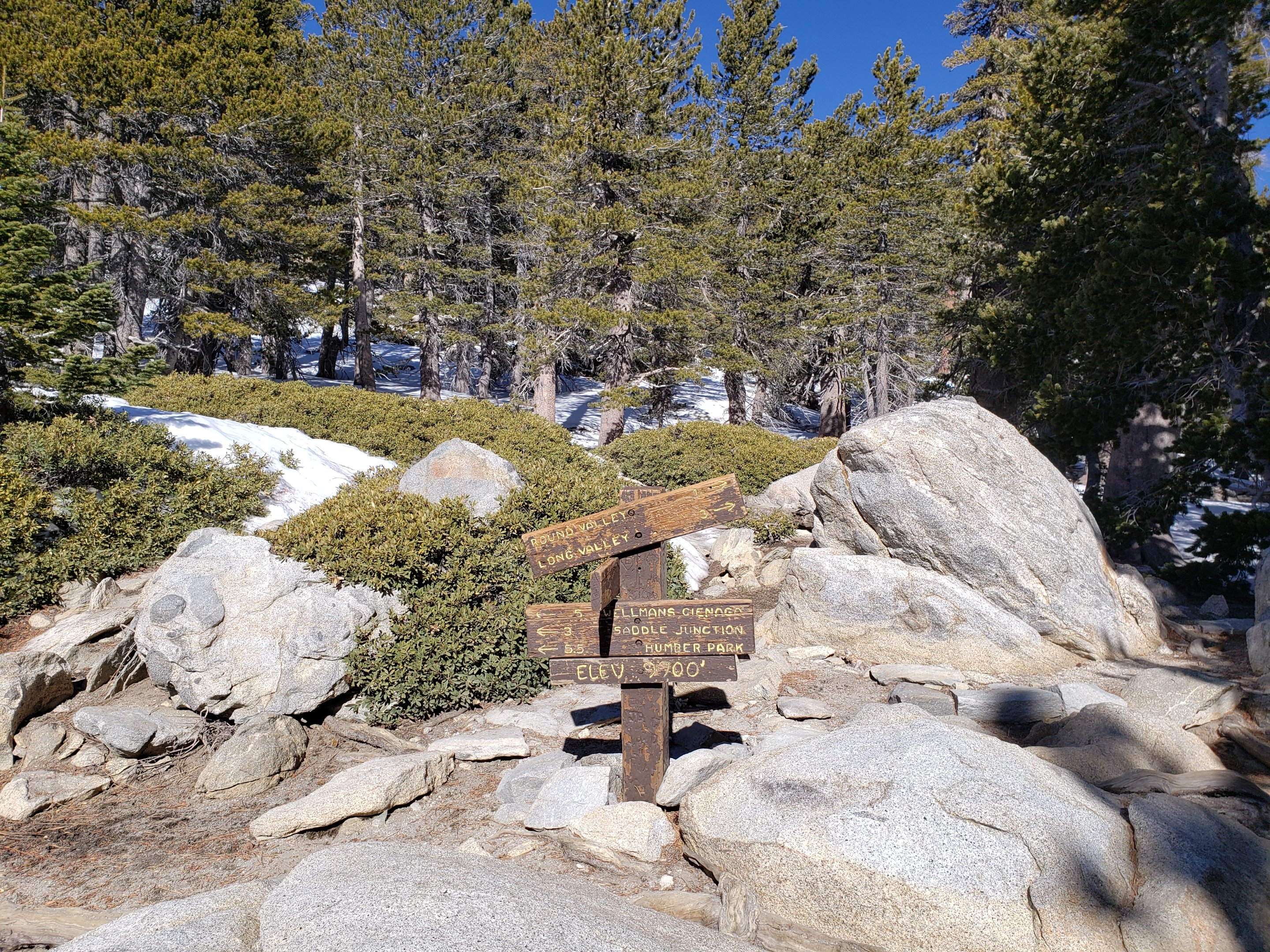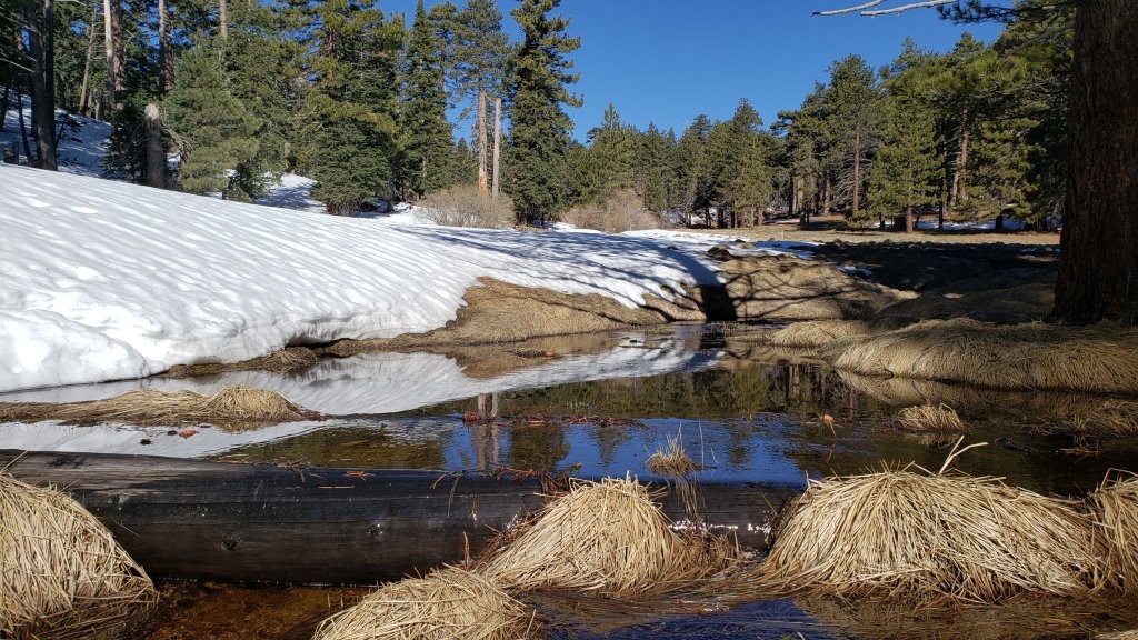 Trails below about 8500′ are generally snow-free, with most trails at higher elevations having limited icy snow patches only. Icy snow on trails persists in traditional areas that are colder and/or less sun-exposed, such as the north face of Tahquitz Peak, in Little Round Valley, on Deer Springs Trail around 9300′ near the North Fork River crossing, at around 10,000′ on the Peak Trail, and between Round Valley and Wellman Divide.